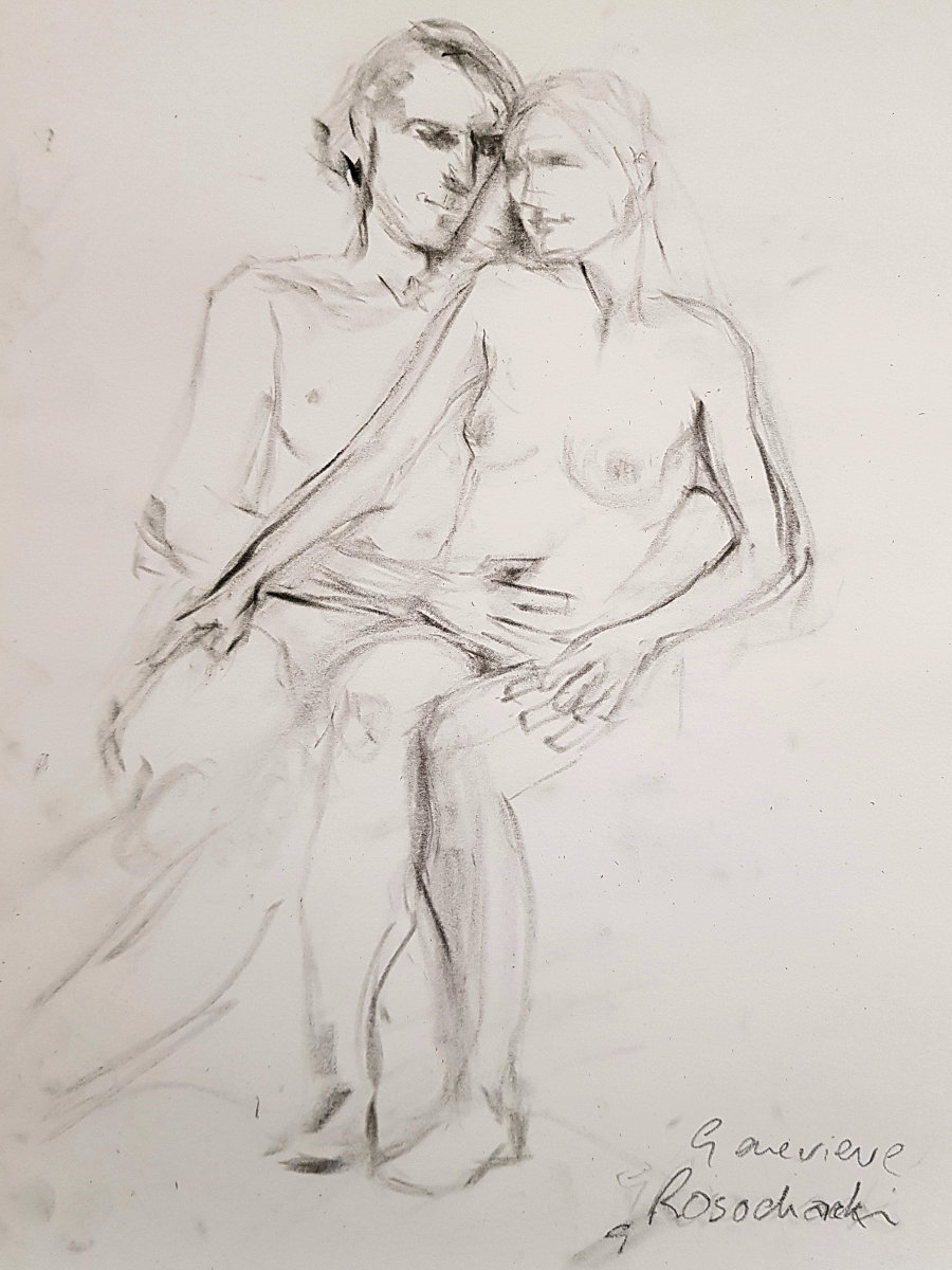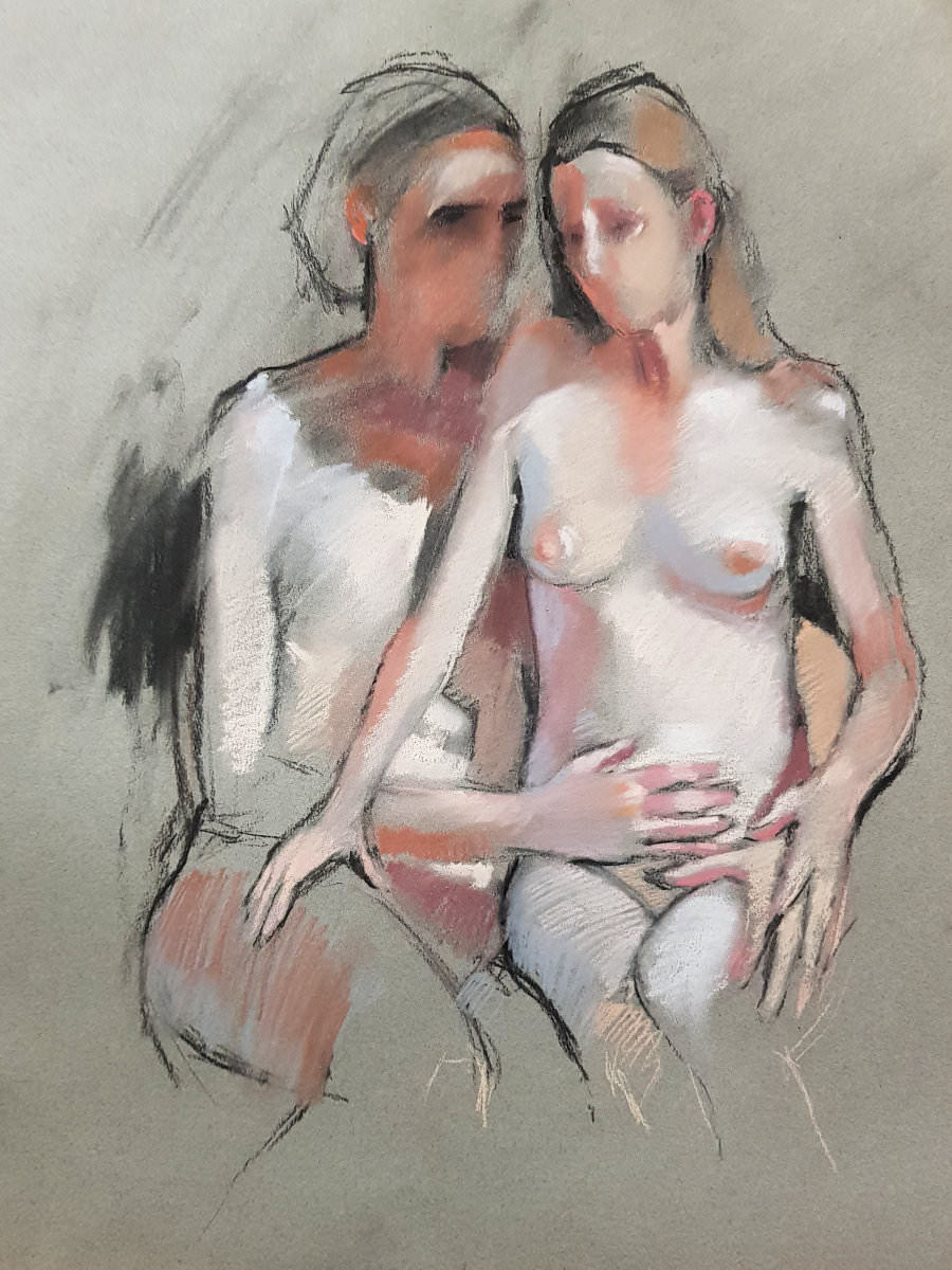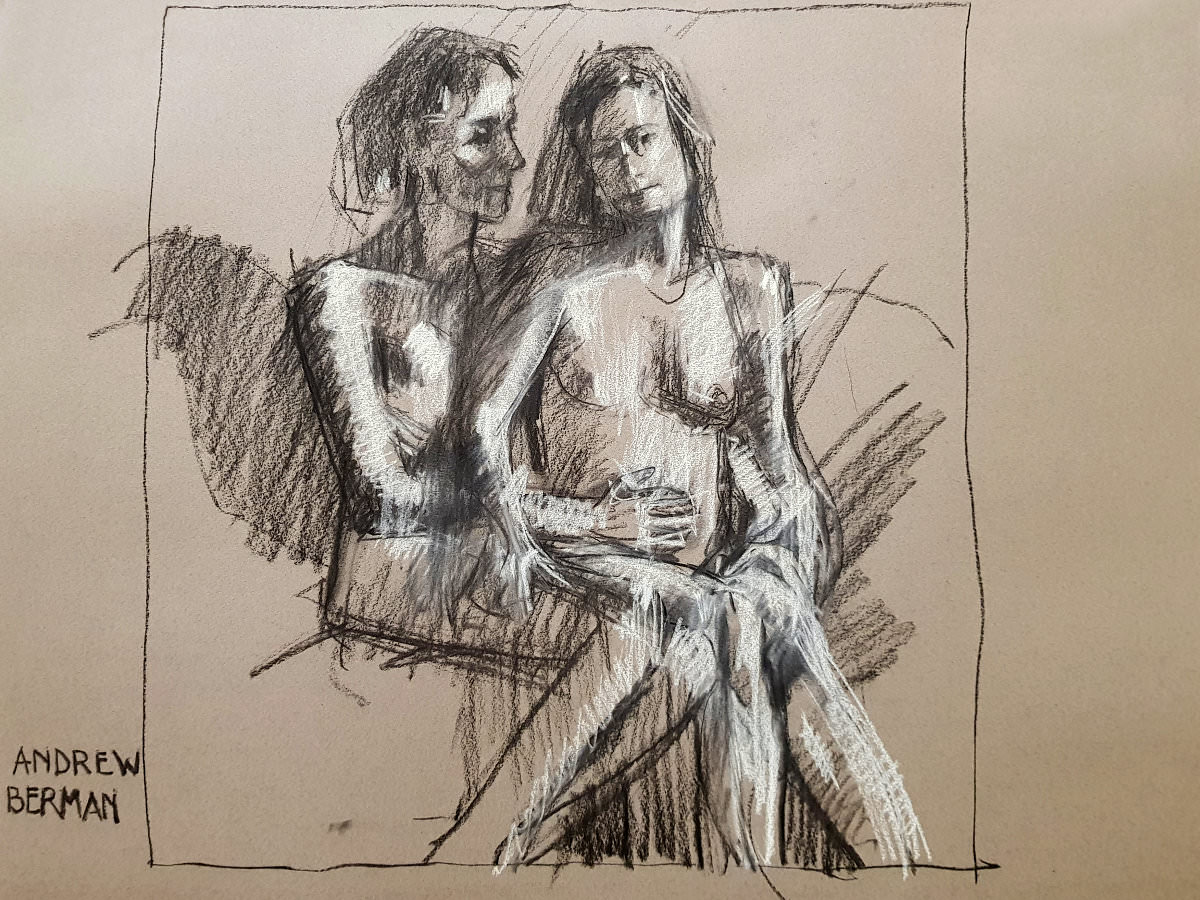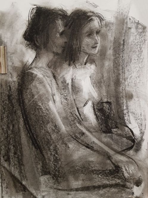 Our sofa was covered with bits of masking tape – legacy place-markers for countless previous models – but we located the ones relevant to us and got into position for our last hour. A couple of stretches for stiff necks and numb arms got us to the finish. The session was unremarkable in its demands on us as models, but I think enriching as a fresh experience for all concerned. There were lots of smiles at the end.