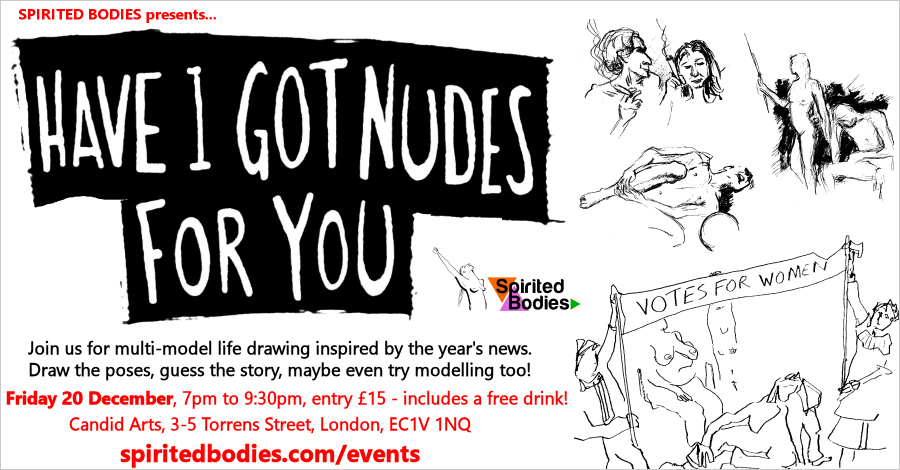 The knowledgeable winner received two free tickets for future Spirited Bodies events, the next of which is set be Body Narratives with London Drawing on 25 January. If artist numbers there match those we had here, it’ll be another special occasion. I had been worried that attendance might be low this close to Christmas, so it was inspiring to see almost thirty people join us. I hope they warmed to our unorthodox ways.