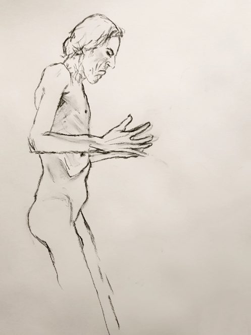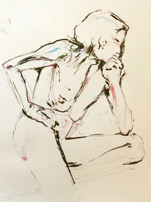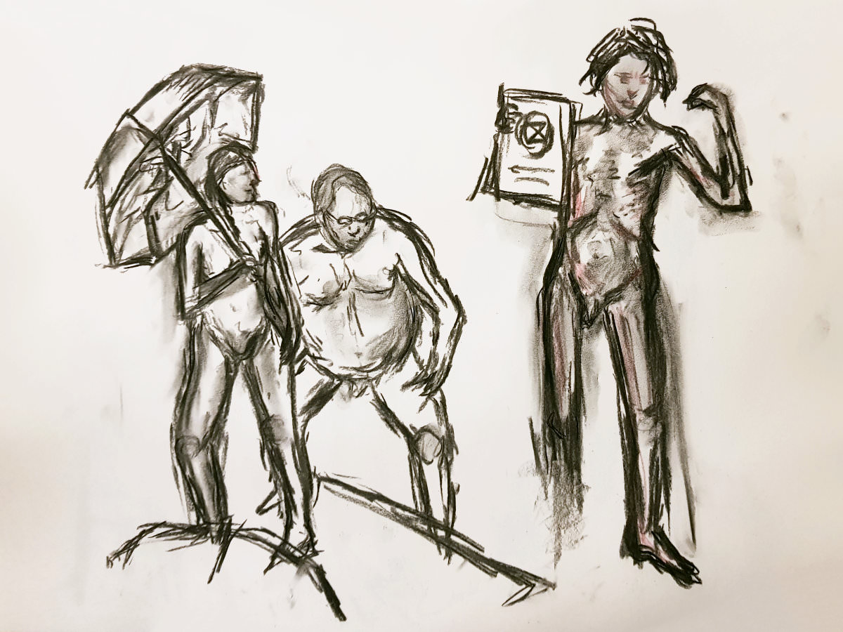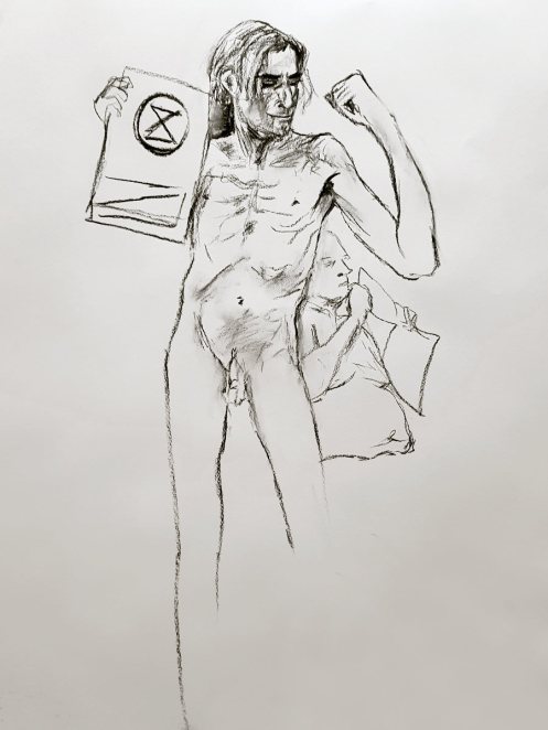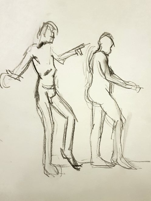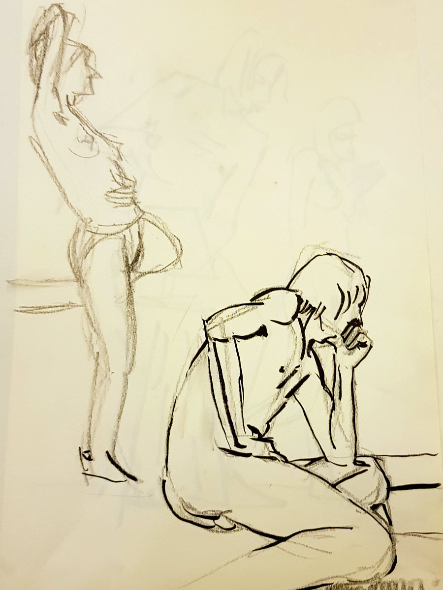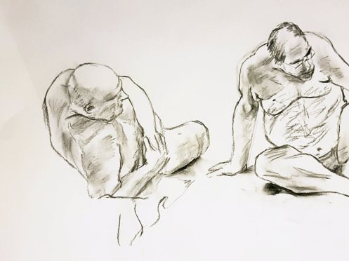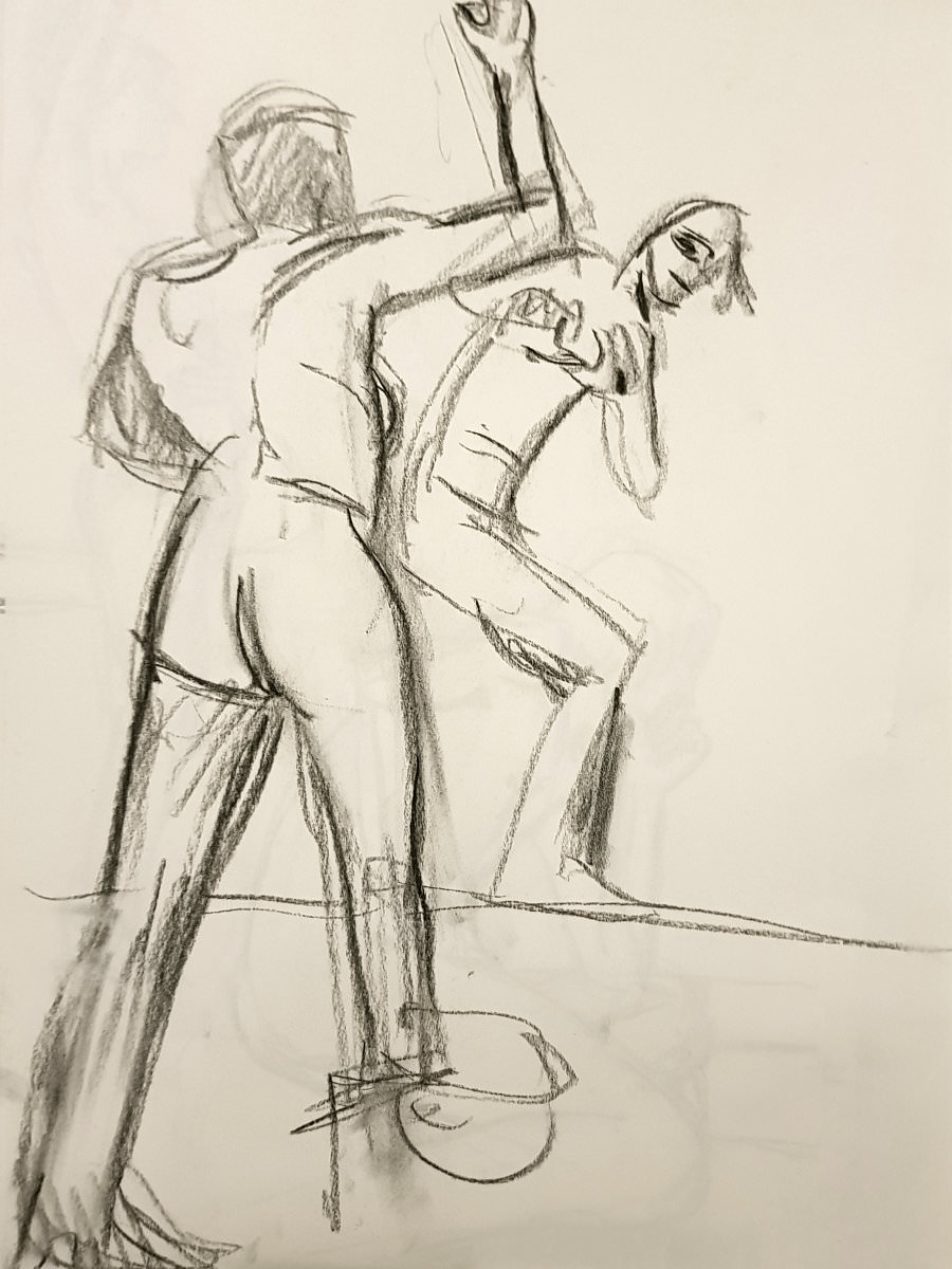 Certainly many of their artworks captured the energy we tried to convey. A few artists sketched elements of different poses onto a single sheet, thereby effectively creating news montages. Just as we models look for new ways of energising artists, so artists continue surprising us with the imagination and talent in their interpretations. It was a grand way to finish life modelling in 2019. Let’s hope 2020 is as much fun.