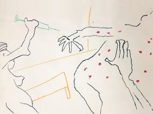 Before our fourth pose I dotted myself all over with the tip of a red lipstick, then fled in fear as Reni came charging at me with a vaccination syringe held aloft…