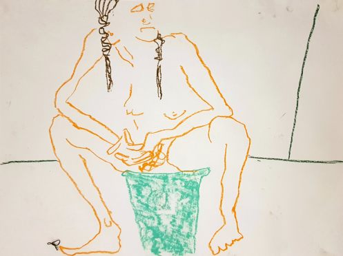 While I struggled to wash-off the lipstick in the bathroom, pigtailed Esther posed solo sitting on a blue plastic bucket with “POO’S ONLY PLEASE” written on the side…