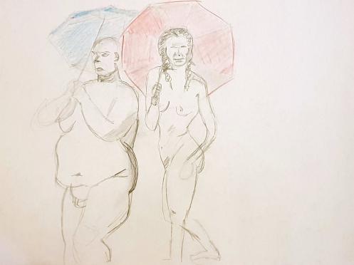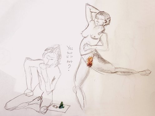 For their last gathering before Christmas, Candid Arts Friday Life Drawing Meetup invited Spirited Bodies to present a ‘Have I Got Nudes for You‘ session, in which life models interpret topical events through dynamic poses and a light-hearted news quiz. Esther would lead the session, with me supporting, and Reni – a guest model – also lending her talents. We arrived early to organise our joyously low-budget props.