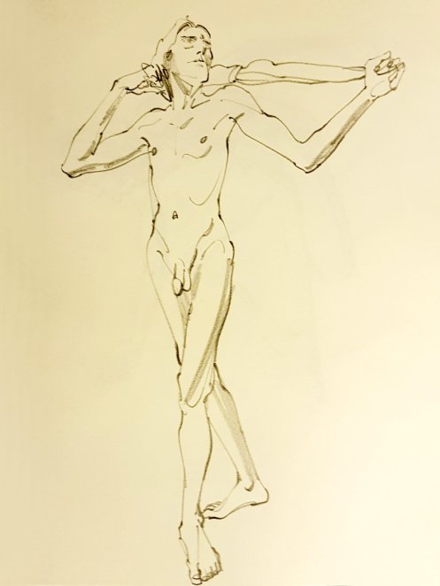 Occasionally I made use of a perching stool, and once I posed with my umbrella, but otherwise it was just me and my body. So many extraordinary drawings were crafted, capturing the figure and often playfully suggesting character. Every line seemed right first time. Thank you, Wei Wu, who created all the wonderful artworks in this post.