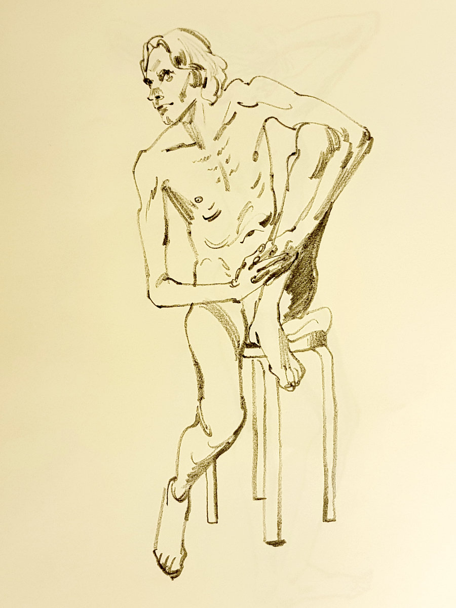 The shorter the poses, the more I have to conjure up, so it becomes a workout for my body and my imagination. We started with three of 1 minute, three of 2 minutes, three of 3 minutes, then one each of 4 minutes and 7 minutes. After a break we pressed on: 5-minutes, 5, 7, 7, 7, 7, 8, 3, 3, 2, 2, 2, 8 and 5 – a mighty 25 poses in total.