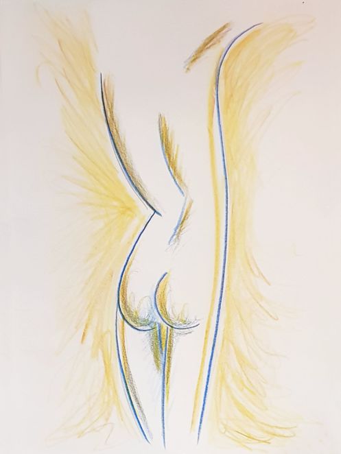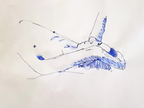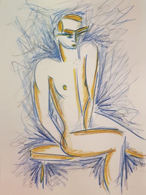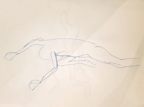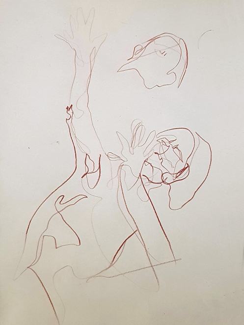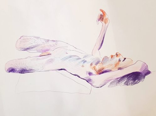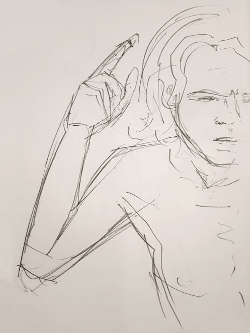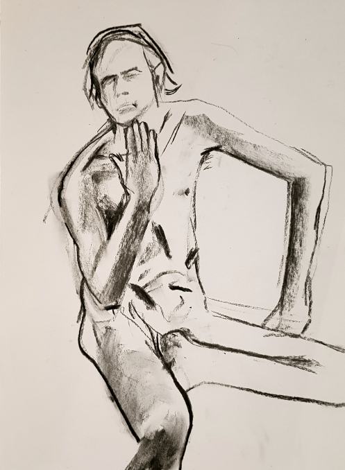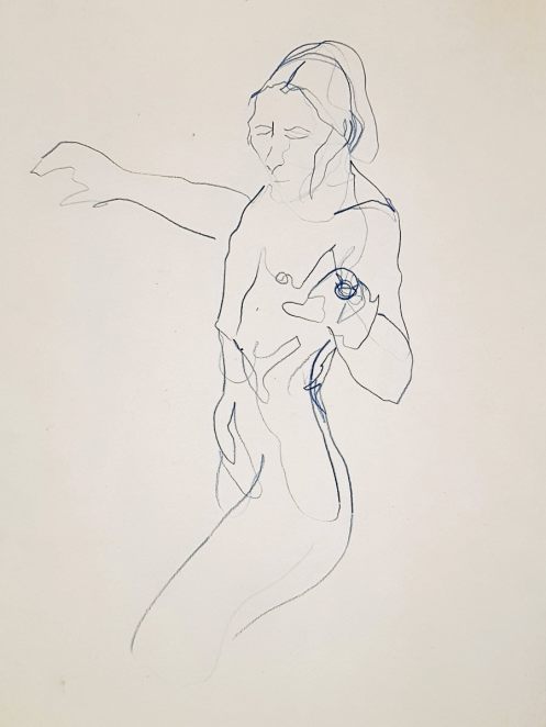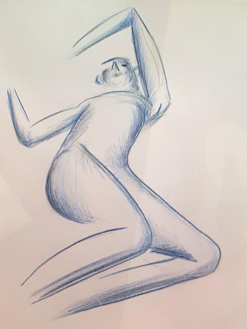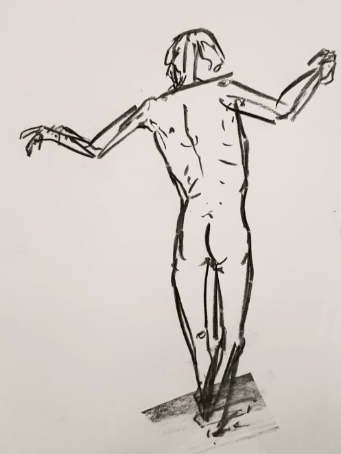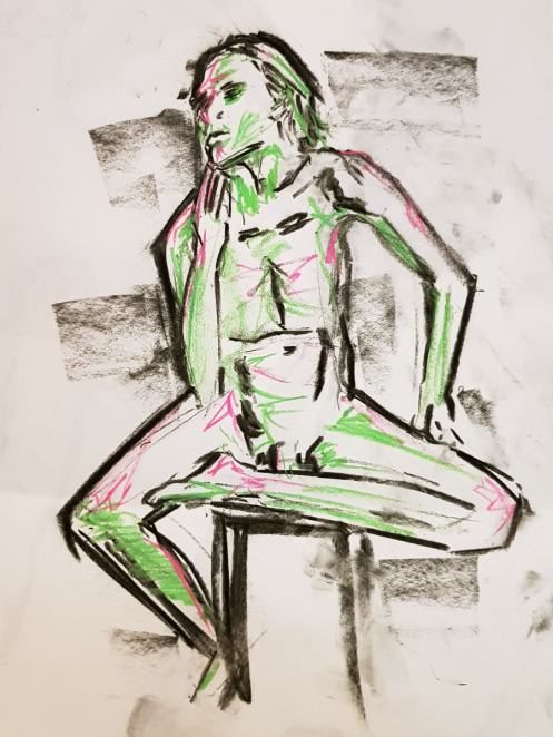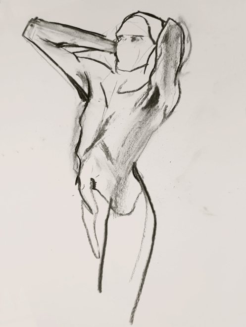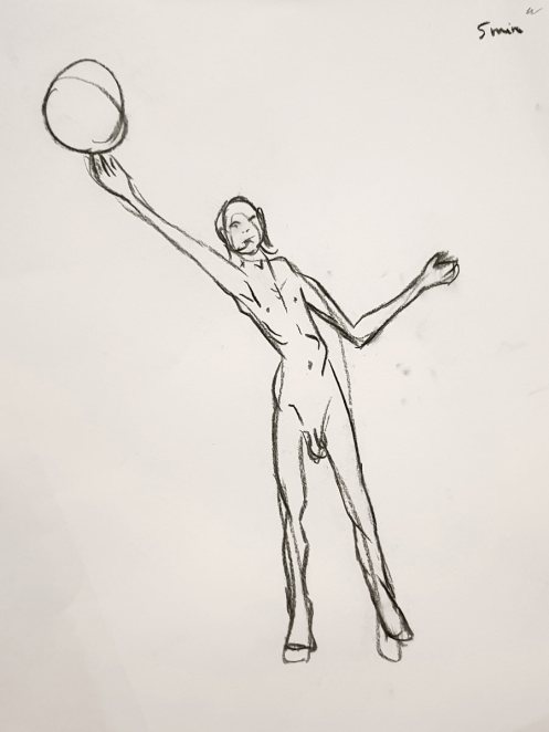 Ah, a rotating a mirror ball hanging from the ceiling at The Star by Hackney Downs! In all my years posing for Drawing the Star, I couldn’t recall noticing that before. So for my opening 5-minute pose, I stood at full stretch, reaching up towards it. And then we continued: 4-minutes, 3, 2, three of 1-minute, three of 30-seconds.