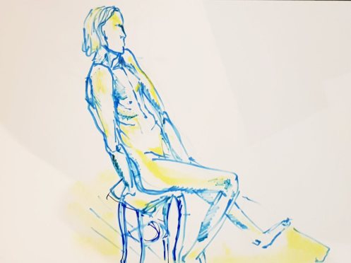 Two poses each of 10-minutes would complete the first half. First I sat on a low stool, one leg extended and body tilted back, then I rotated and stood with elbows high and hands curled down on shoulder tops. A reliable playlist and flawless timekeeping took me through comfortably to our drinks break. A large red wine awaited.