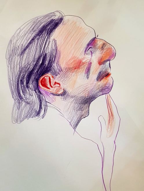 It was a busy night, with about seventeen artists seated about the walls of The Star’s upstairs function room. A show-of-hands vote for our second half pose times seemed to have resulted in a tie between three of 10-minutes and two of 15-minutes… that is, until a latecomer returned, one hand holding his pint, the other held aloft for fifteens.