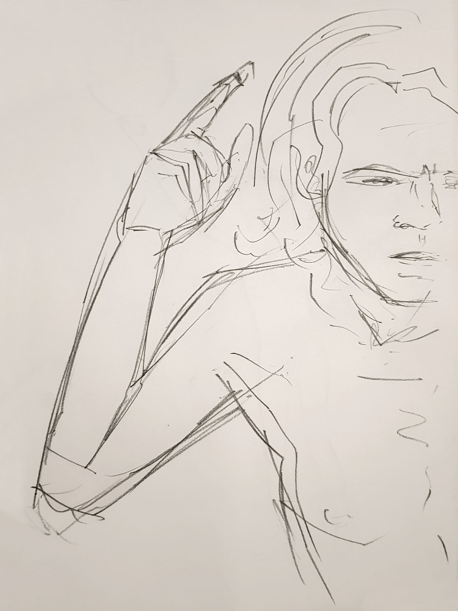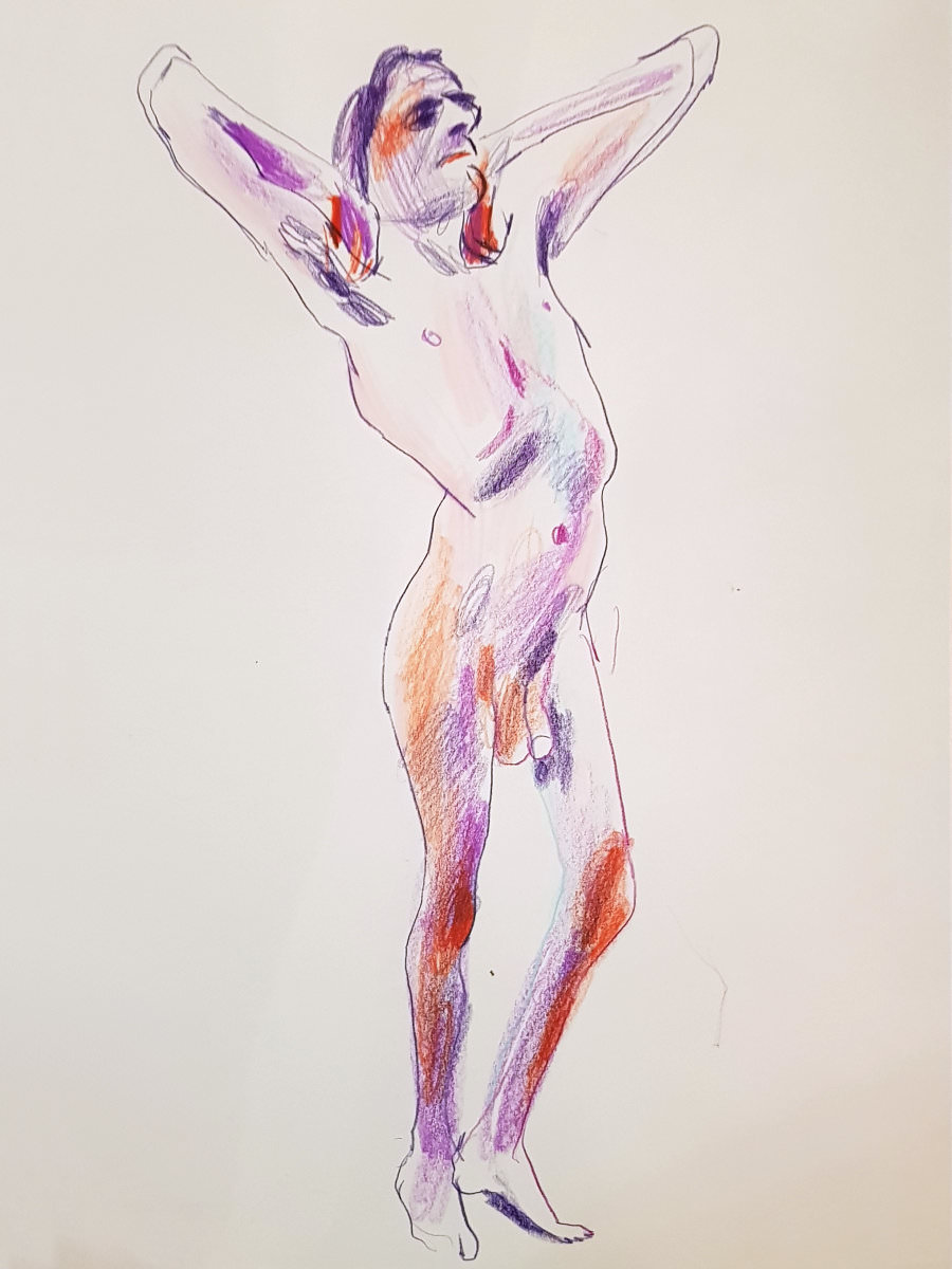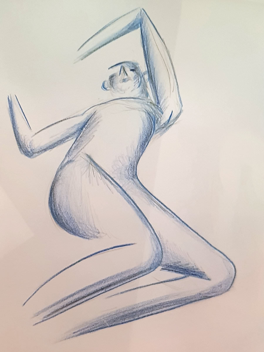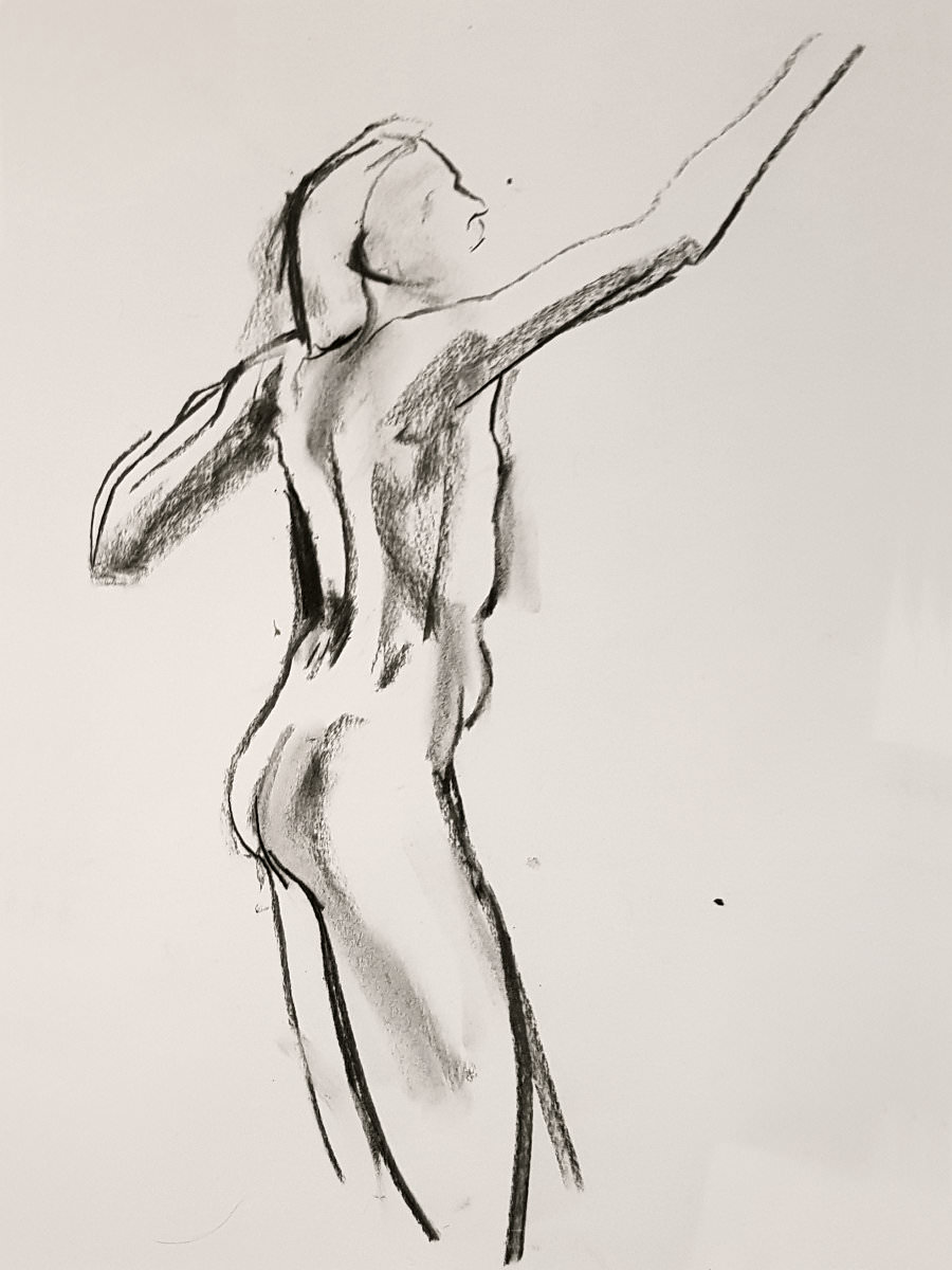Ah, a rotating a mirror ball hanging from the ceiling at The Star by Hackney Downs! In all my years posing for Drawing the Star, I couldn’t recall noticing that before. So for my opening 5-minute pose, I stood at full stretch, reaching up towards it. And then we continued: 4-minutes, 3, 2, three of 1-minute, three of 30-seconds.