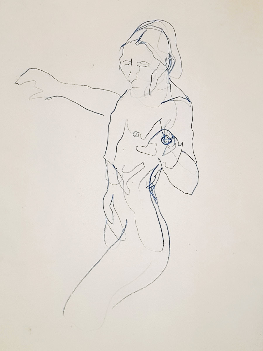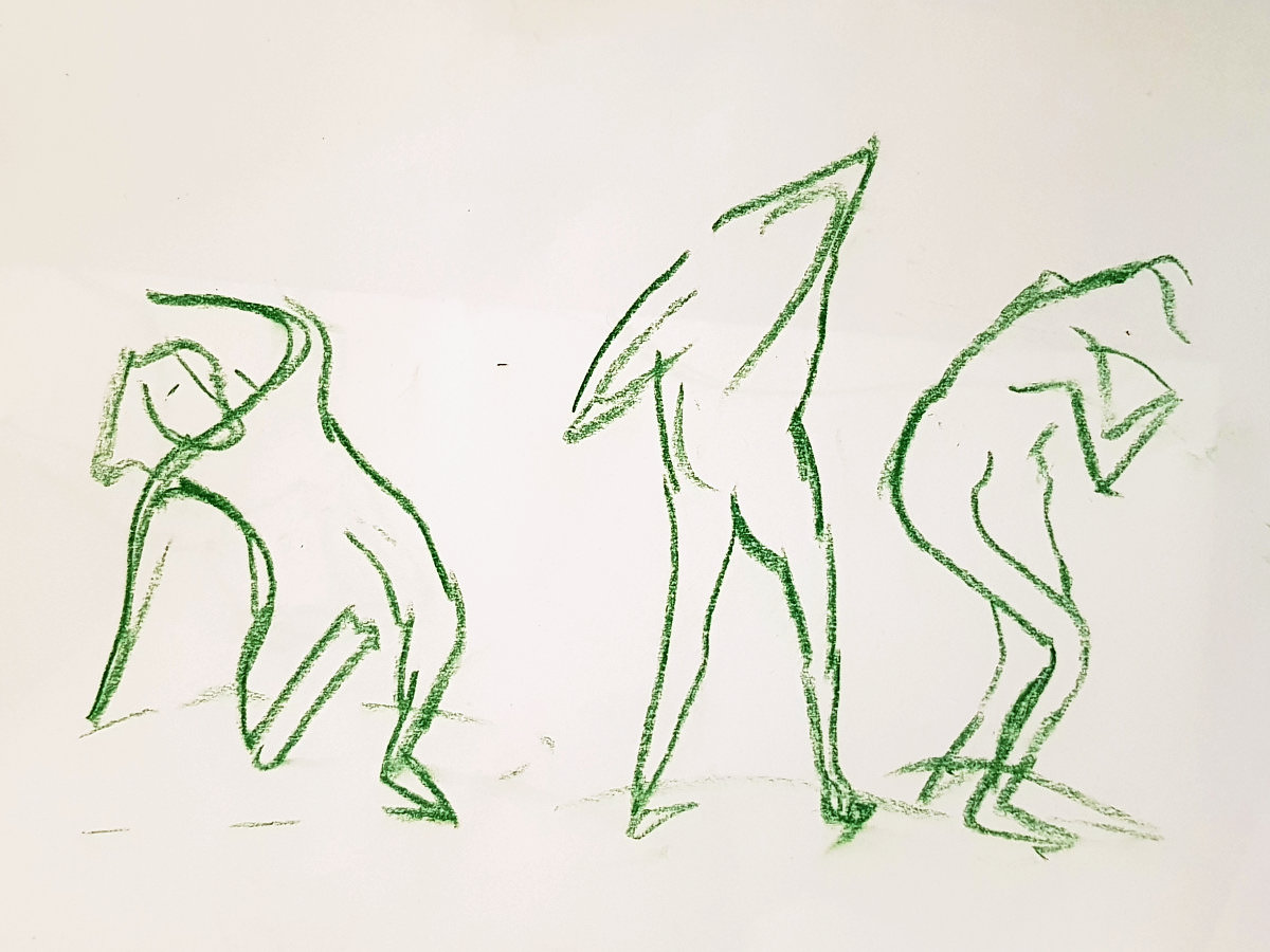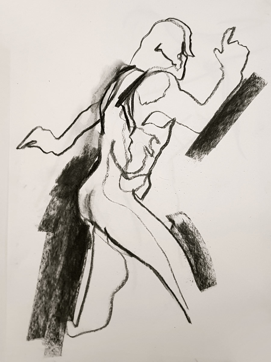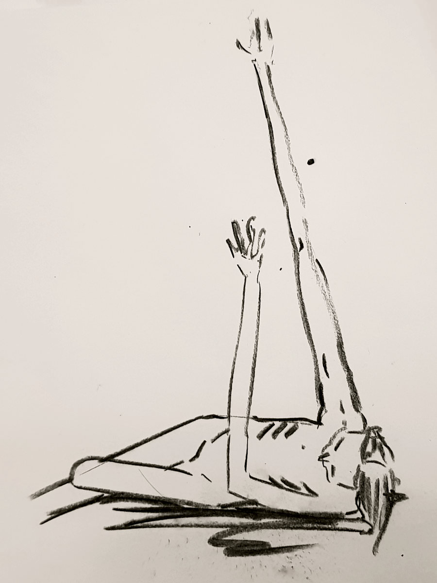 Ah, a rotating a mirror ball hanging from the ceiling at The Star by Hackney Downs! In all my years posing for Drawing the Star, I couldn’t recall noticing that before. So for my opening 5-minute pose, I stood at full stretch, reaching up towards it. And then we continued: 4-minutes, 3, 2, three of 1-minute, three of 30-seconds.