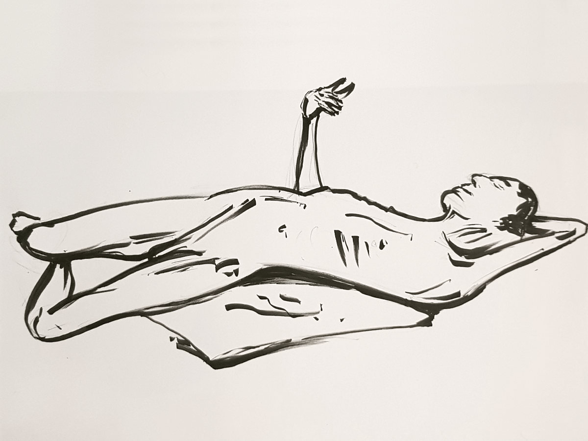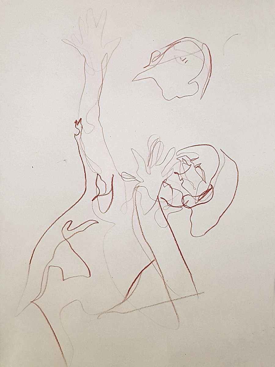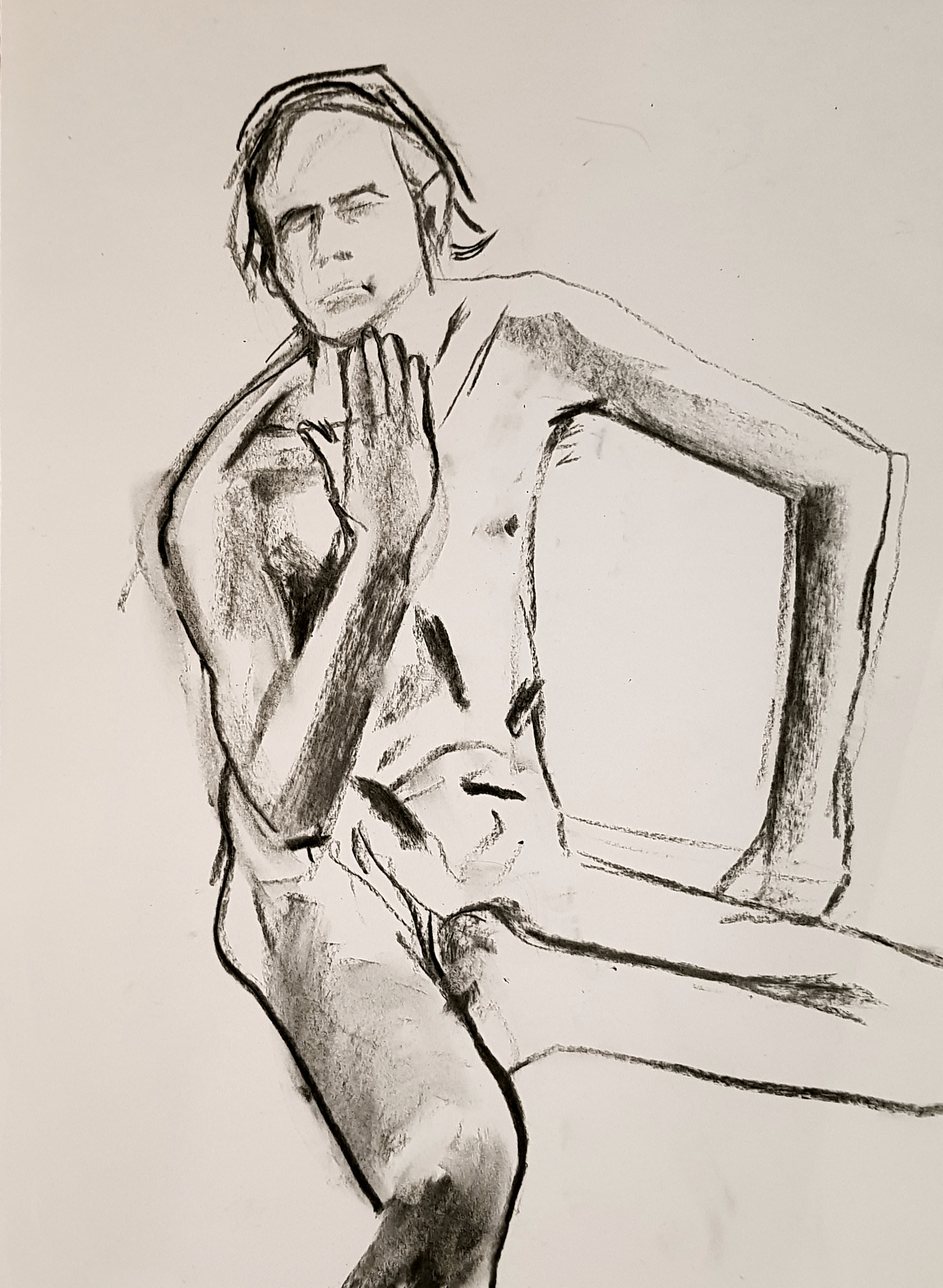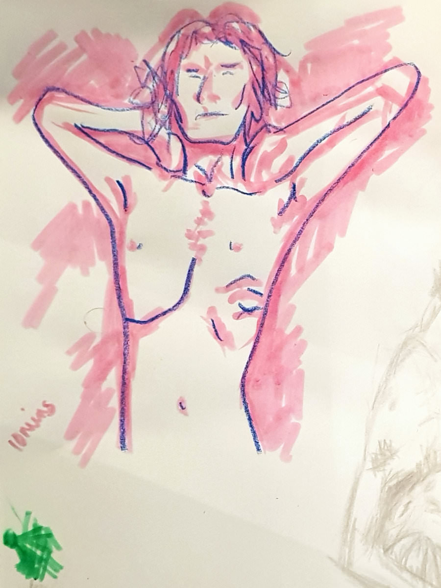 Ah, a rotating a mirror ball hanging from the ceiling at The Star by Hackney Downs! In all my years posing for Drawing the Star, I couldn’t recall noticing that before. So for my opening 5-minute pose, I stood at full stretch, reaching up towards it. And then we continued: 4-minutes, 3, 2, three of 1-minute, three of 30-seconds.
