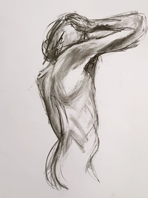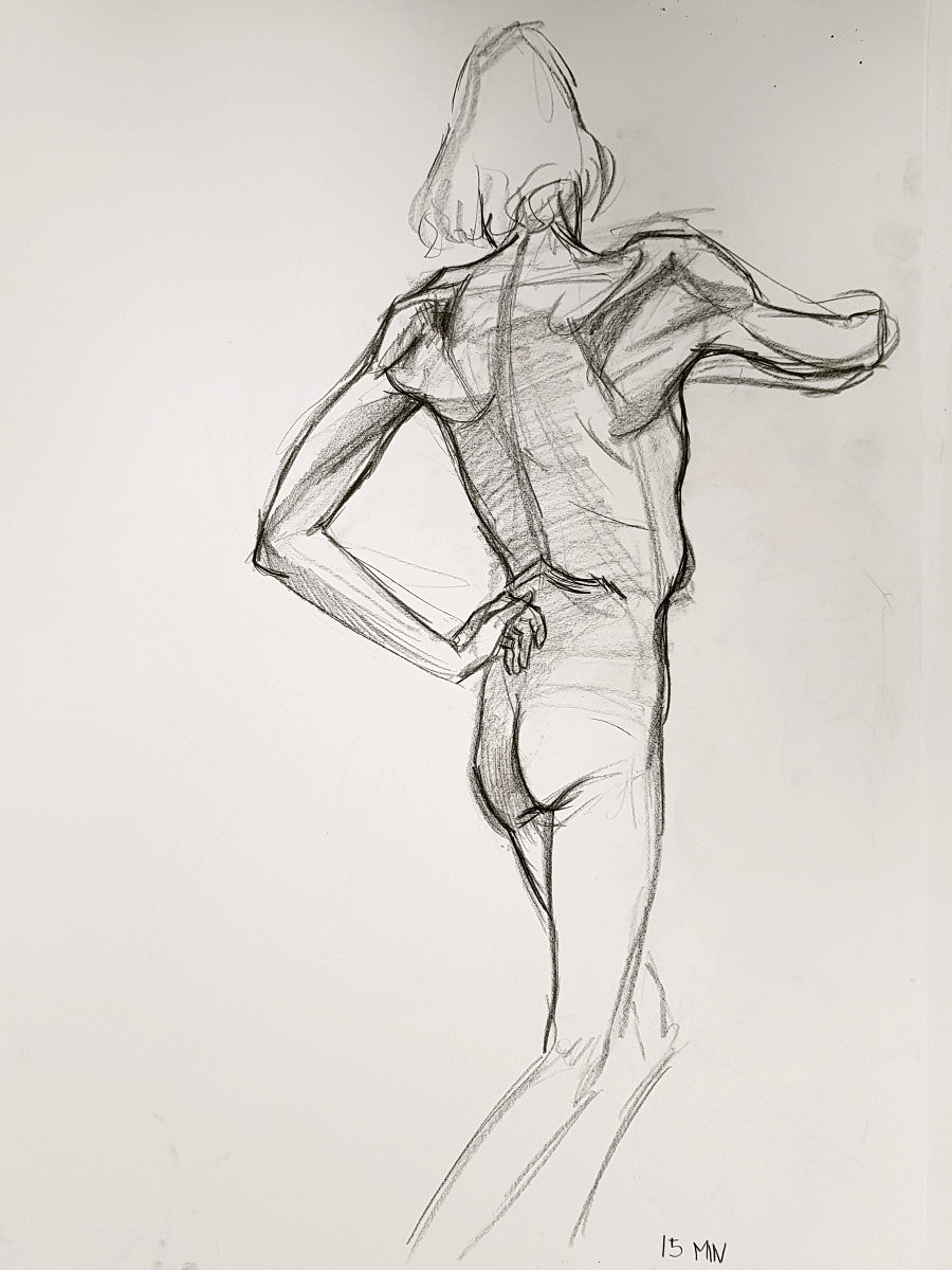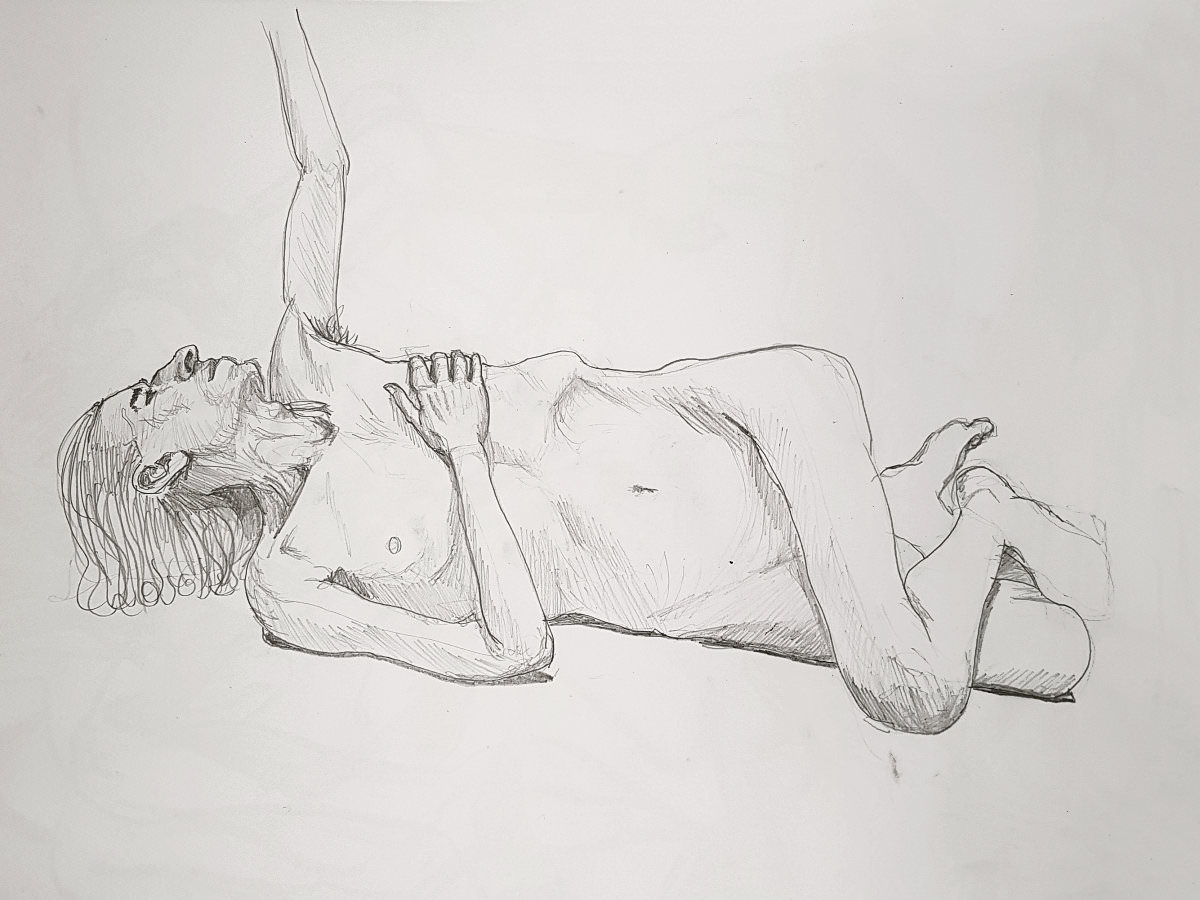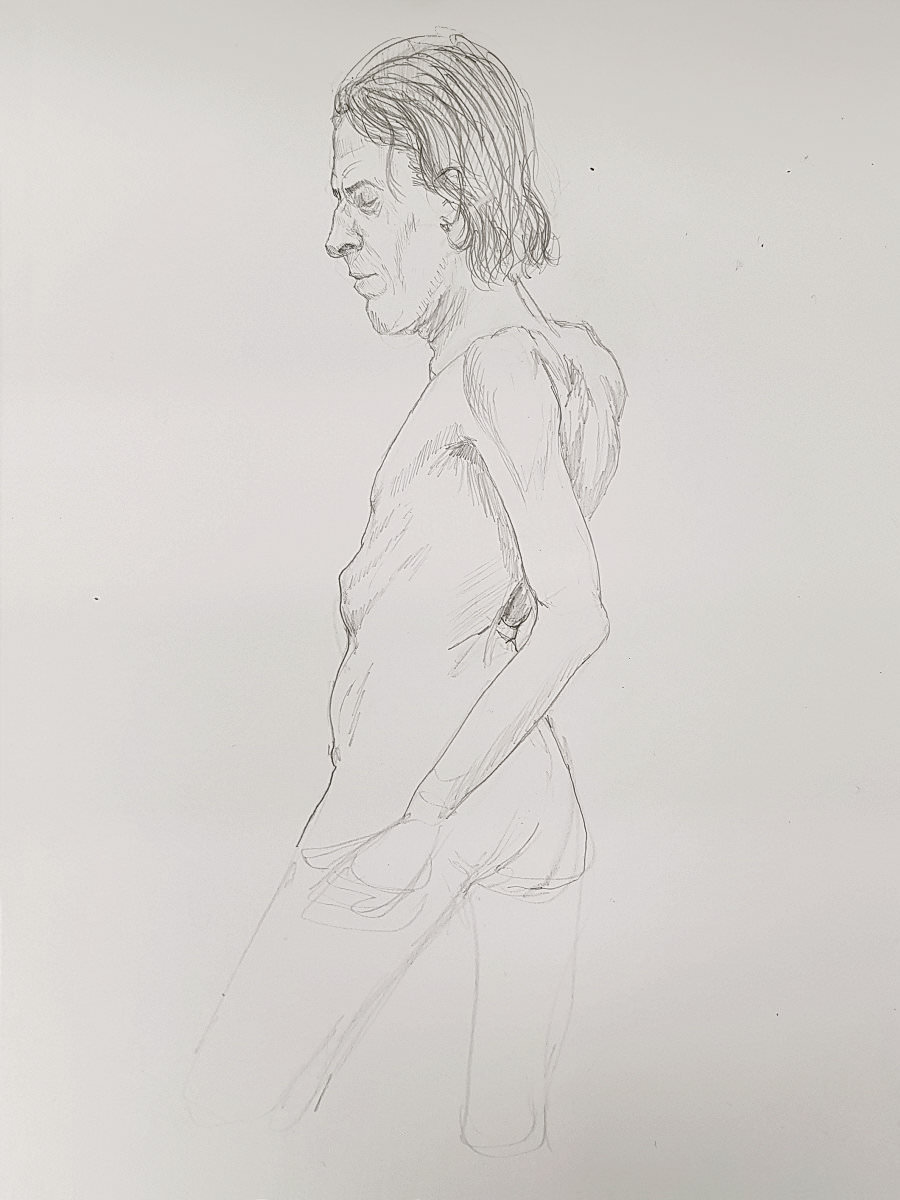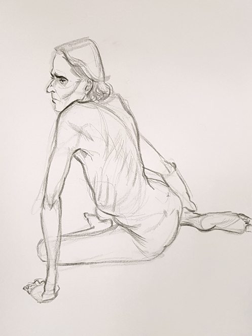 An hour earlier I’d started the session with a 15-minute standing pose, during which a couple of late arrivals filled the last seats and made it another full house. We followed with five 1-minute poses, then poses of 5 minutes, 10 minutes and 20 minutes, taking us to the interval. I suspected the 20 minutes might have drifted closer to half an hour, but I was comfortable and quite happy laying down in front of two heaters.