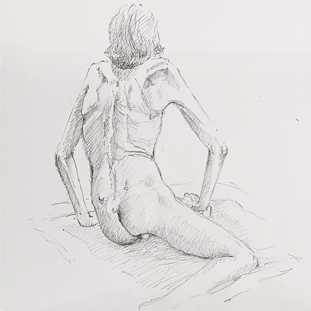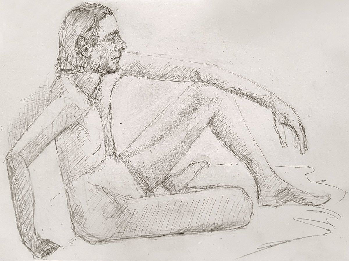 …or maybe I was just being paranoid; either way, I was glad when we got started. We were down on numbers from my last visit, but the setting-up of tables, chairs, easels, heaters and extension cables still takes time. Eventually with a horseshoe of artists in position around me, I opened with a 15-minute standing pose, followed by 30-minutes seated on the floor. Only the scratchy sounds of mark-making on paper and the warm hum of two highly effective heaters broke our silence.