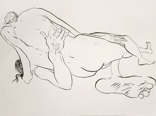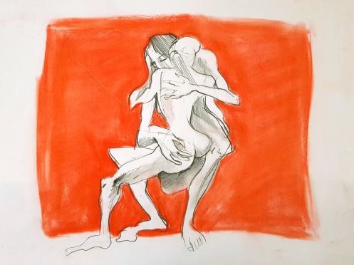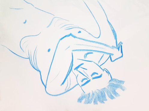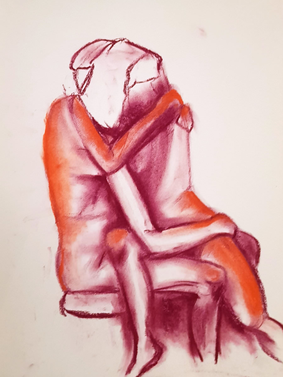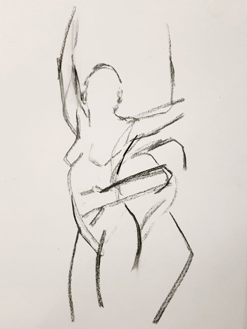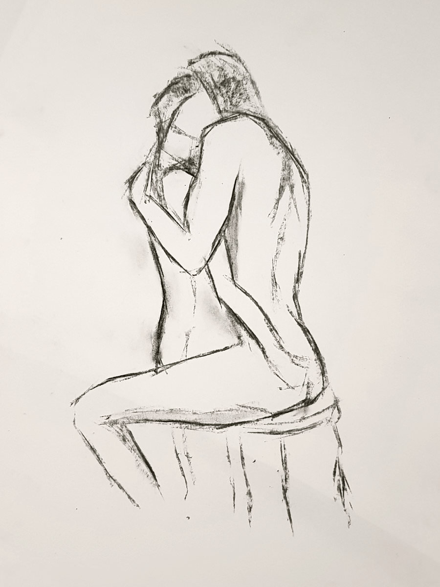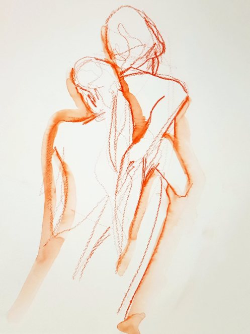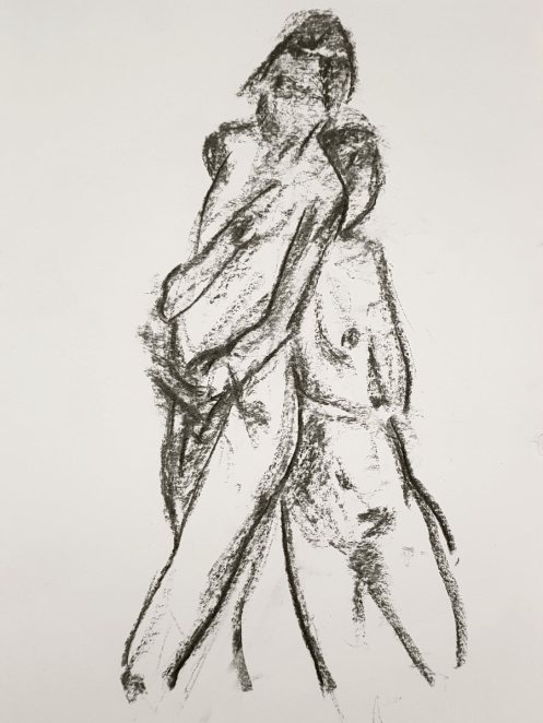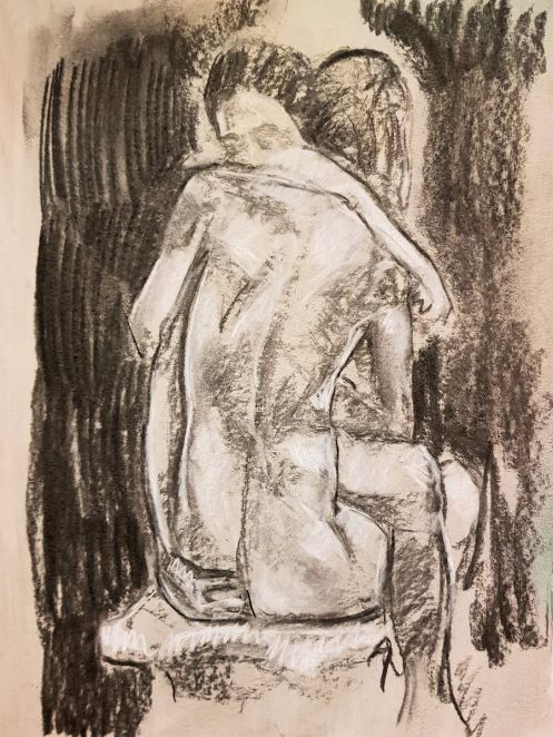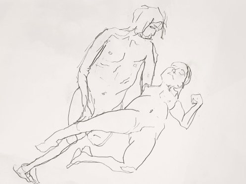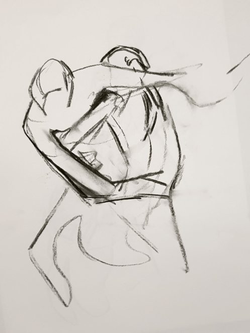 With two models together as a couple, there is sure to be cuddling at some point. We saved ours till last. Cuddles must be deployed sparingly, otherwise all the poor artists get to draw is a succession of backs. Mindful of this, we sat holding each other tightly in an asymmetrical embrace.
