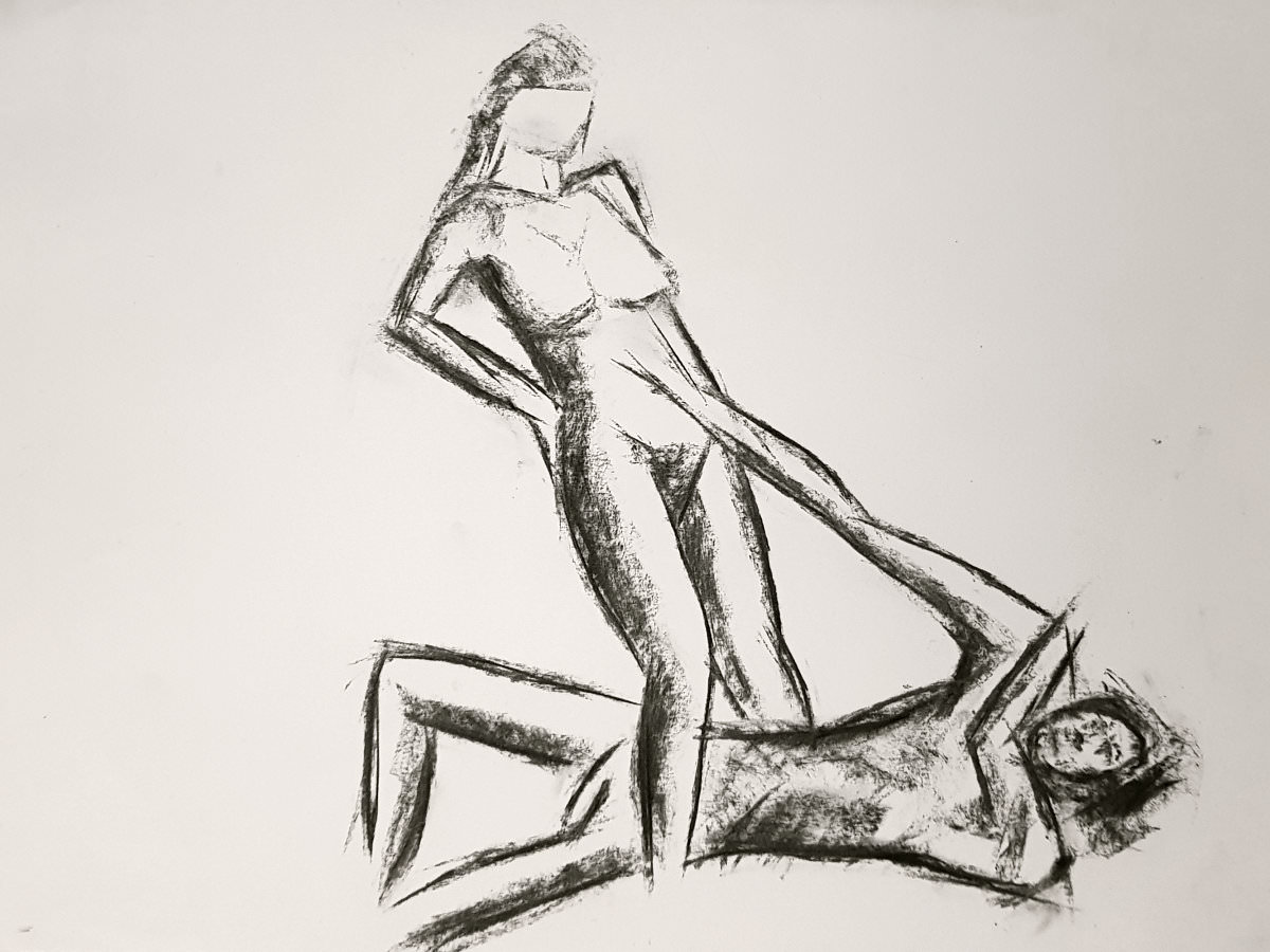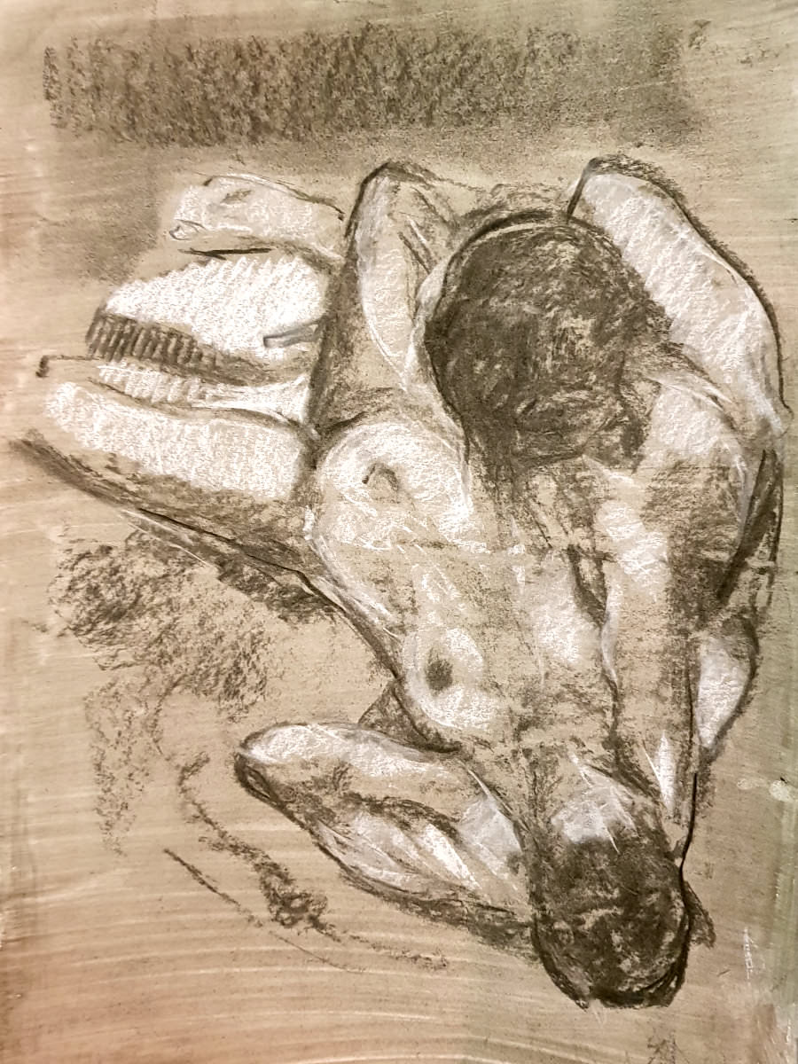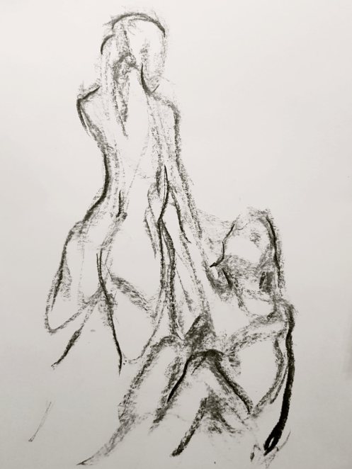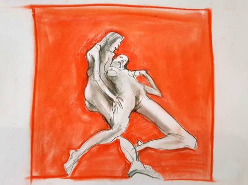 For our second 2-minute pose, Esther stood while I sat on the floor holding her hands and her gaze. Star artist Giovanni Forlino immediately hailed it the cutest pose he’d ever seen, so as an antidote we wrestled for the final 2-minutes. With 22-minutes left till the break, Esther loomed above me as I stretched one hand up to her belly.