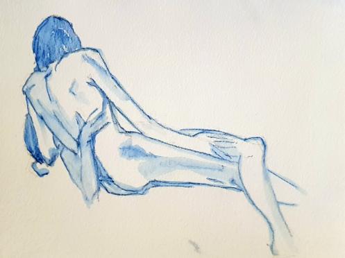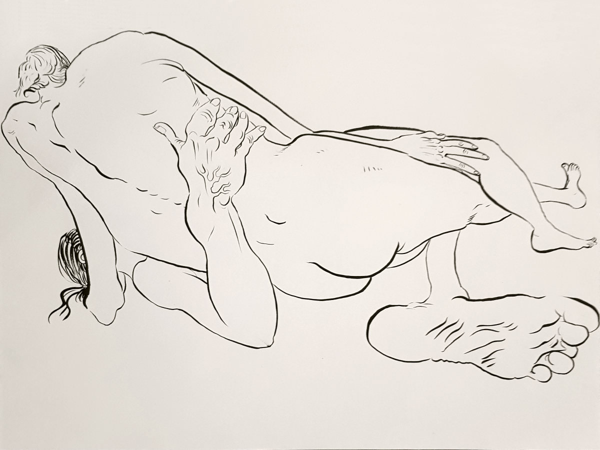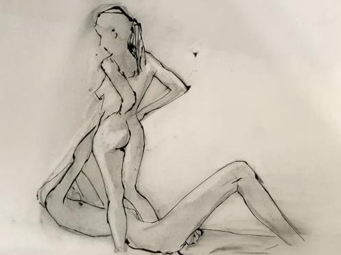 Drinks were taken, and then a vote was taken: should we wrap-up with one 30-minute pose, two of 15 minutes, three of 10 minutes, or a 20 and a 10? A show of hands was unambiguous in calling for two 15s. We started by reclining together, me leaning over and gently cradling Esther’s impeccably sprawled form.