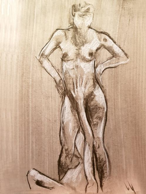 It was nice to get a goodly gathering of artists around us, including long-time regulars and welcome new faces. This group has a genuine community spirit – drink and draw as it should be – where the highly-proficient and complete novice can relax and enjoy their art side-by-side. Three poses of 2-minutes each came next.