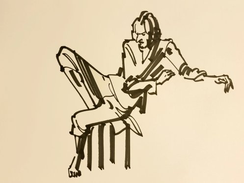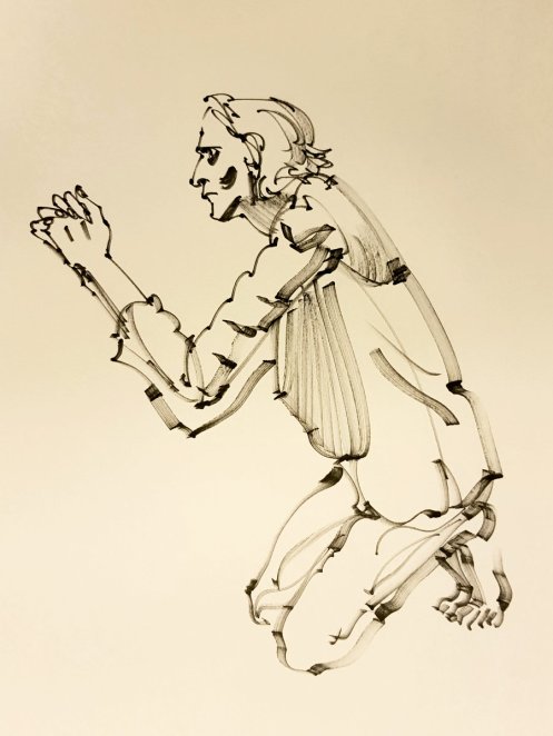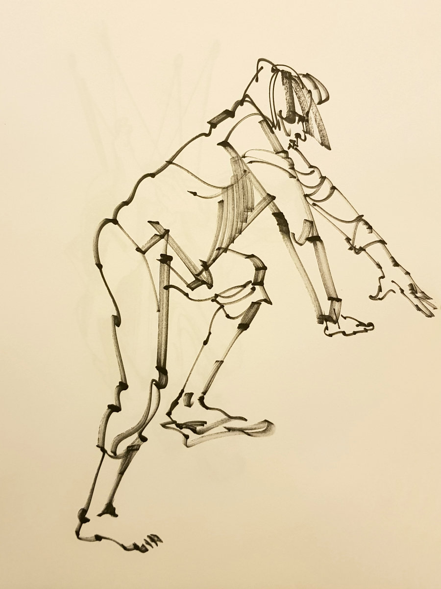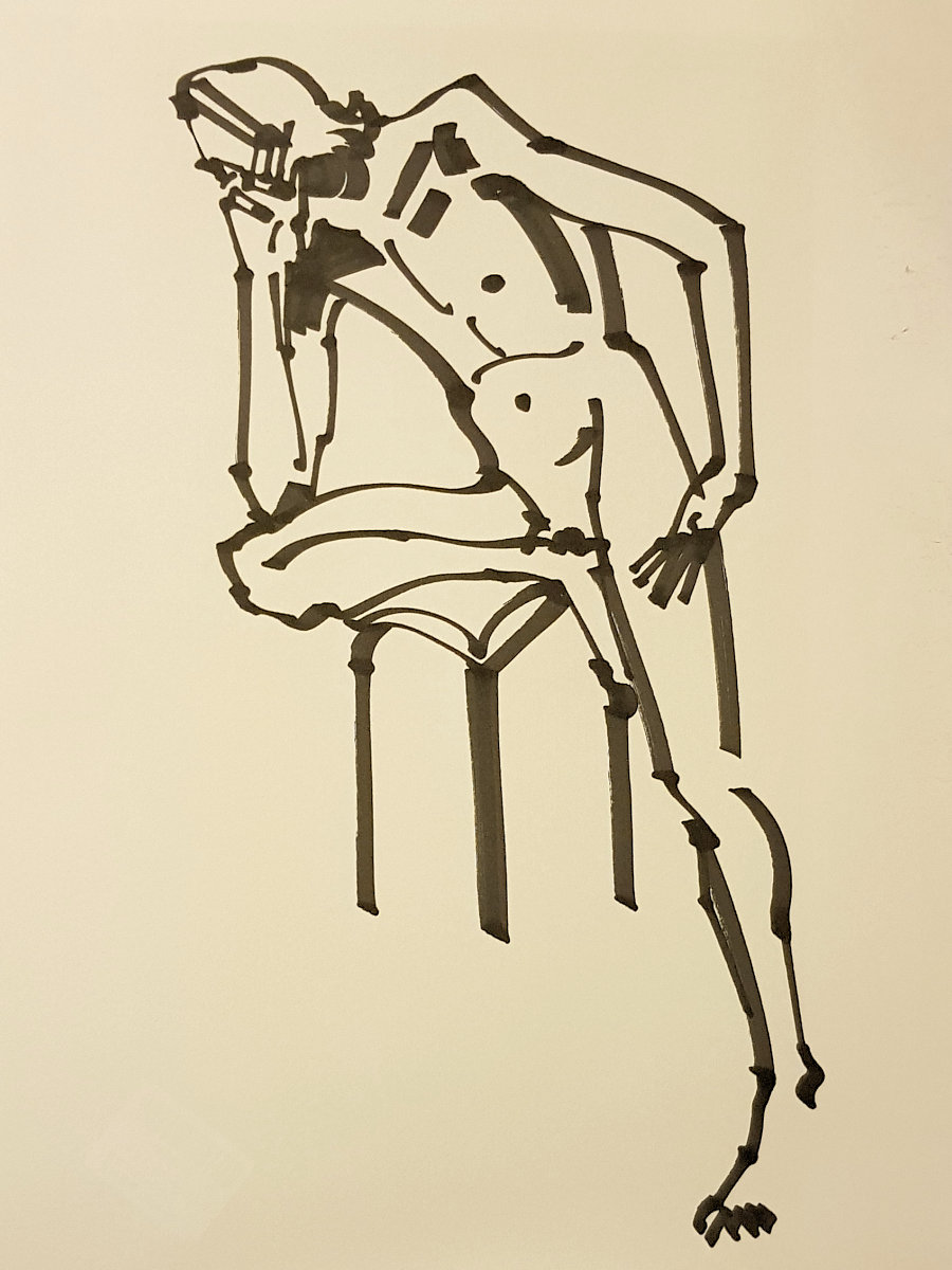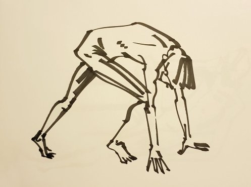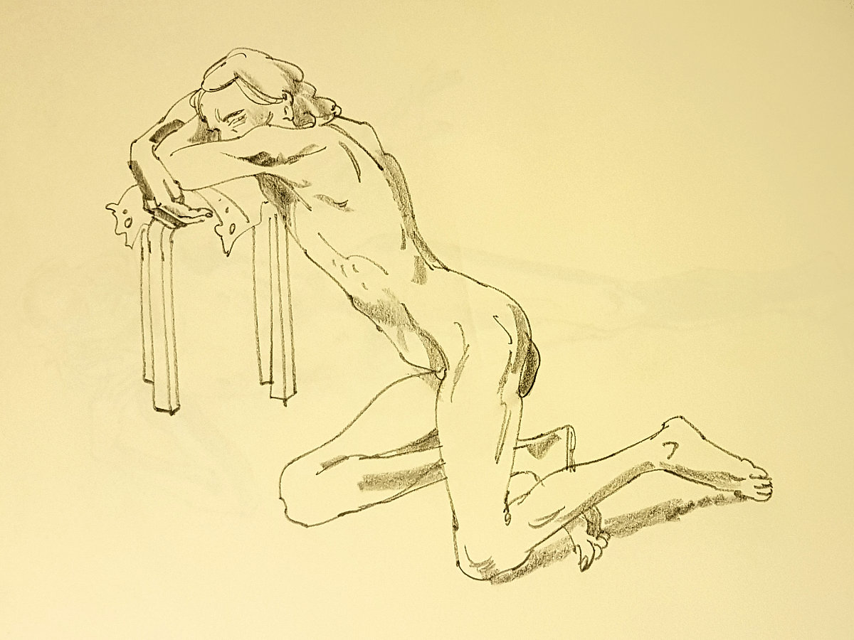 When we resumed, it was with five poses of 3-minutes and five poses of 7-minutes. I oscillated high and low: standing up, down on the floor, in a chair, under the table, on a stool; in fact, any place and shape that my imagination could conjure. Time enough remained for poses of 6 minutes, 3 minutes and 3 minutes, taking us to the end. Lots of fun. I do like the expressive possibilities of dynamic work.