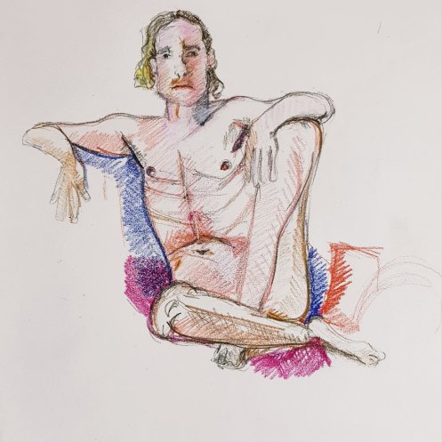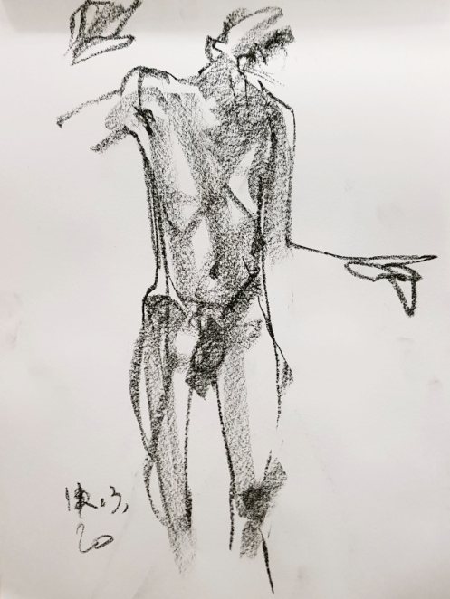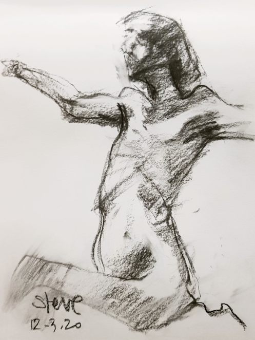 One person left us during the break, apparently more overwhelmed by six foot four of nude angles than by fears of a global pandemic. Others remained resolute and it was nice to chat about passions rather than pathogens. For the second half, I resumed by perching on the edge of a high stool with my torso twisted and left arm bent forward.