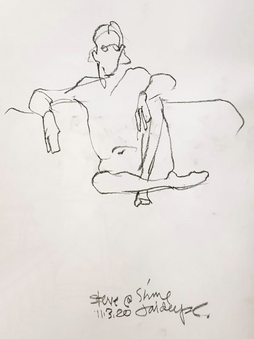 After 15 minutes on the stool there was time for one final pose of 35 minutes. I asked the group whether they would prefer me standing, sitting or reclining and got greatest encouragement for a seated pose on the Shine sofa. Fine by me. I settled myself into an agreeable composition. It was to be my last pose until… who knows when?