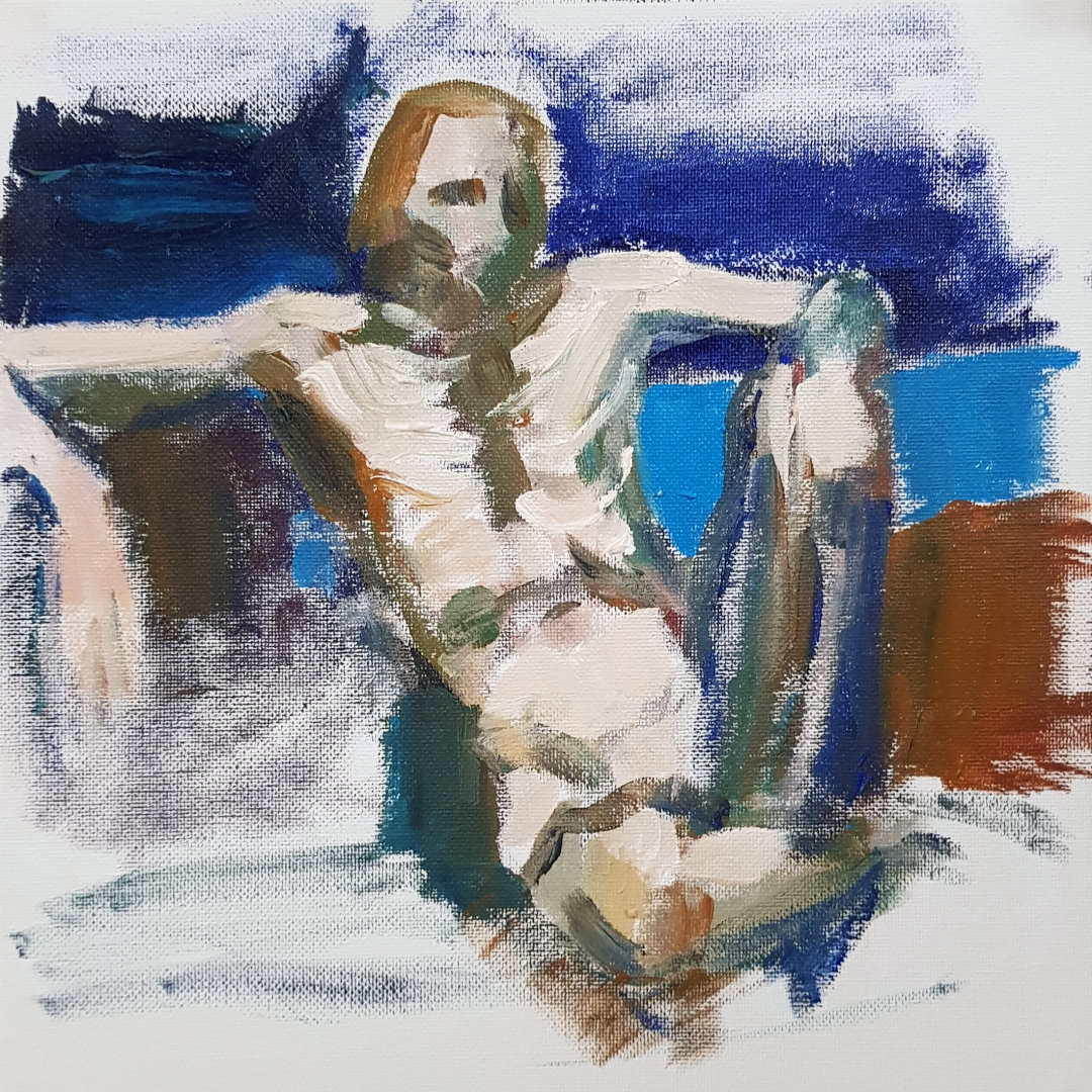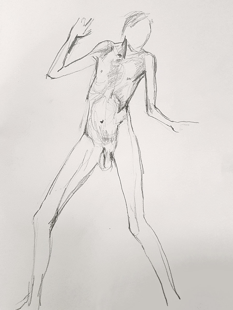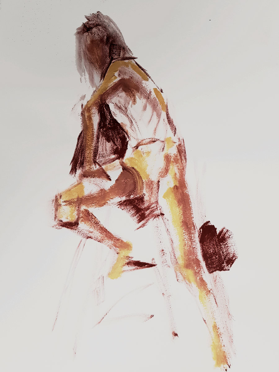 One person left us during the break, apparently more overwhelmed by six foot four of nude angles than by fears of a global pandemic. Others remained resolute and it was nice to chat about passions rather than pathogens. For the second half, I resumed by perching on the edge of a high stool with my torso twisted and left arm bent forward.