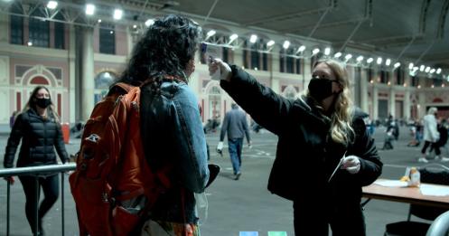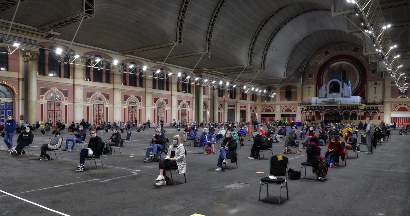 Chairs inside the halls were arranged as a socially-distanced grid, 9 feet away from each other. At a rough count, it seemed to me there were 200 chairs set-out in four blocks of fifty, 5 chairs wide and 10 rows deep. Our red zone was the back-left block. We found our chairs, sat down and waited patiently as remaining empty chairs in the hushed hall were filled and a few more were brought out. Every five minutes, a dude with a microphone at the centre of the hall read the same strict safety instructions…