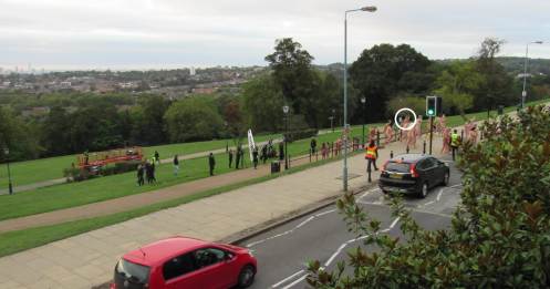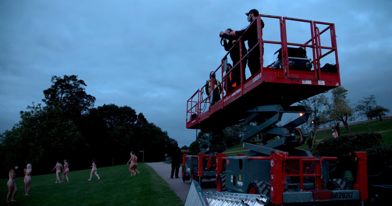 We left the main hall and turned right, descended a first set of steps, crossed South Terrace road, descended more steps followed by a patch of lawn and a footpath, then began spreading out on the grassy slope below. Spencer and his assistants awaited on an industrial elevating platform positioned on the footpath, so for the opening shot we would be situated between the artist and a sliver of crimson daybreak beyond an otherwise overcast London skyline.