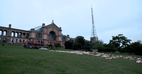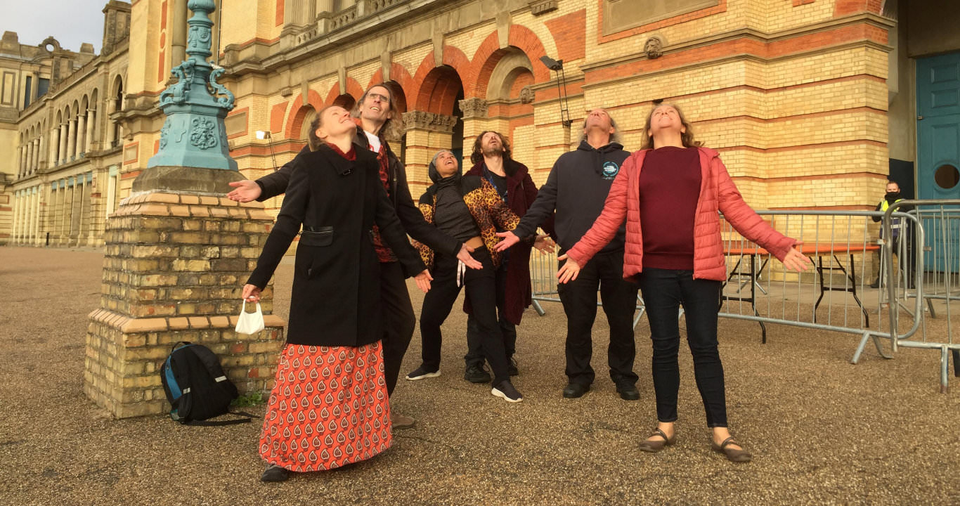 Upon returning to our feet, we were asked to go back up the grassy slope, across the footpath and assemble on the patch of lawn between Spencer and Alexandra Palace. This was a much smaller area, however, so those that couldn’t fit (socially-distanced) were directed to the terrace above, or even onto the balcony of the palace itself. Here we stood with bodies, faces and palms forward – the magnificent palace façade at our backs – for what would be my favourite artwork from the shoot.
