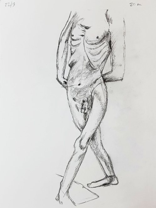 The group had clearly been missing social interaction as much as life drawing so our quarter-of-an-hour break ended up running to 25-minutes. It’s another vital part of life drawing groups that can’t be recreated online. Once underway again, we finished the evening with poses of 20 and 25 minutes. The temperature dropped towards the end but not enough for a heater to have been desirable. Overall, it went very well.