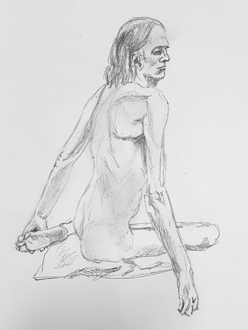 Full credit to the group’s organiser, Natansky, who posed nude for the first session to get a sense of how it could be for subsequent models. For this session she joined us at the set-up, but had to depart before our 7:30pm start – her regular artists would be running the show; deciding the pose lengths and keeping time. Many of us knew one another, so trust was already there. We began with poses of 5, 5, 10 and 20 minutes.