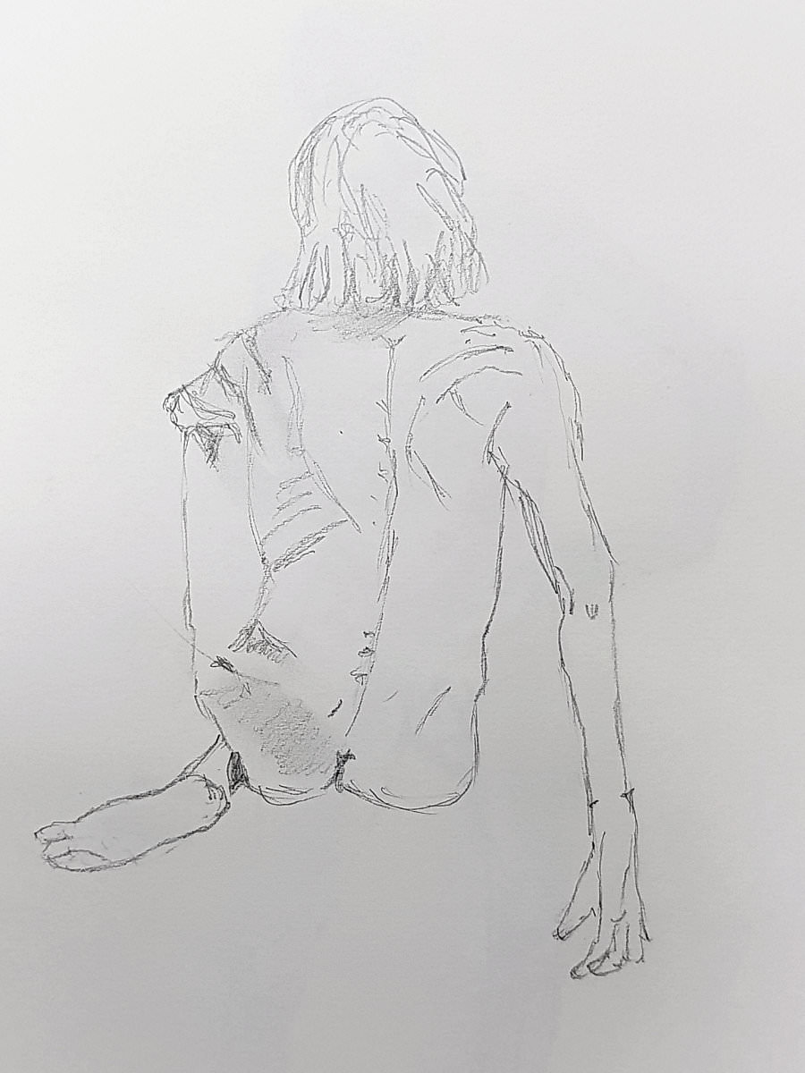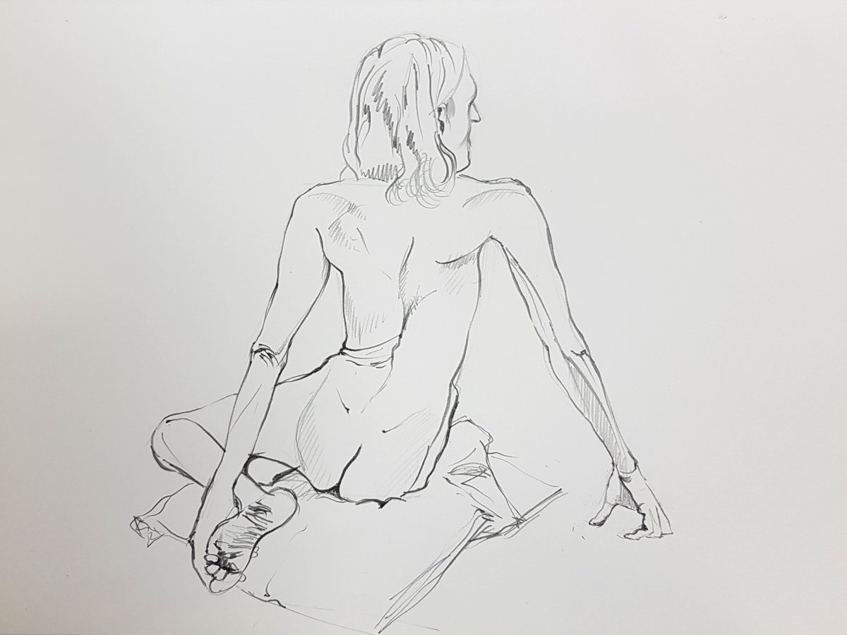 Mine was only the second session for LeNu Life Drawing since Fairkytes reopened. New rules were now in play. For a start, a larger room was given over to life drawing, which allowed better social distancing. I would be in the round rather than having my back to a wall. Most eyebrow-raising from a life model’s perspective, however, was a requirement to have windows open. Fortunately for me, it was a warm evening.