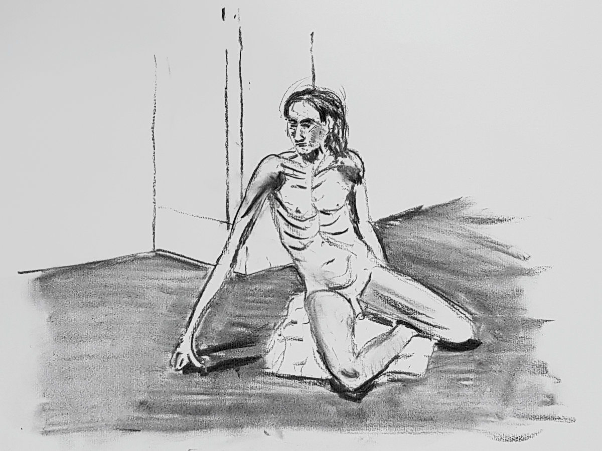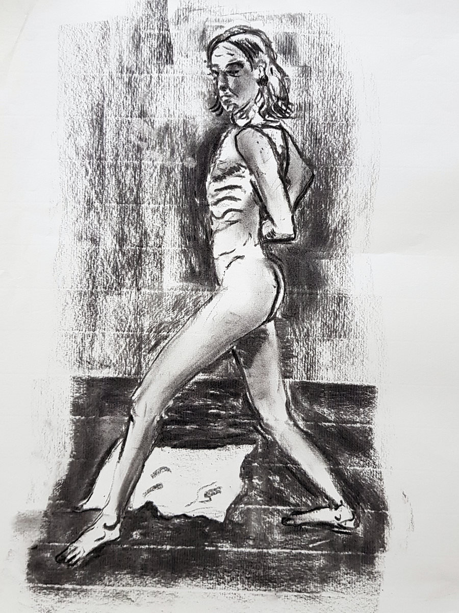 Full credit to the group’s organiser, Natansky, who posed nude for the first session to get a sense of how it could be for subsequent models. For this session she joined us at the set-up, but had to depart before our 7:30pm start – her regular artists would be running the show; deciding the pose lengths and keeping time. Many of us knew one another, so trust was already there. We began with poses of 5, 5, 10 and 20 minutes.