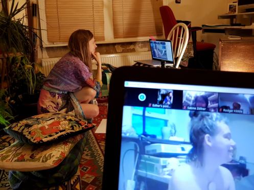 As a warm-up practice before Spirited Bodies, she ran ‘Lockdown life ~ at home with Esther‘ – an online life drawing and performance event for a modest-sized audience, which allowed us to trial the best technical approach. This included testing the use of three webcams, though we stayed with only two for Spirited Bodies. The anniversary event went extraordinarily well with 40 people taking part, including Esther and seven others modelling. It was a genuine feel-good occasion shared with many old friends.