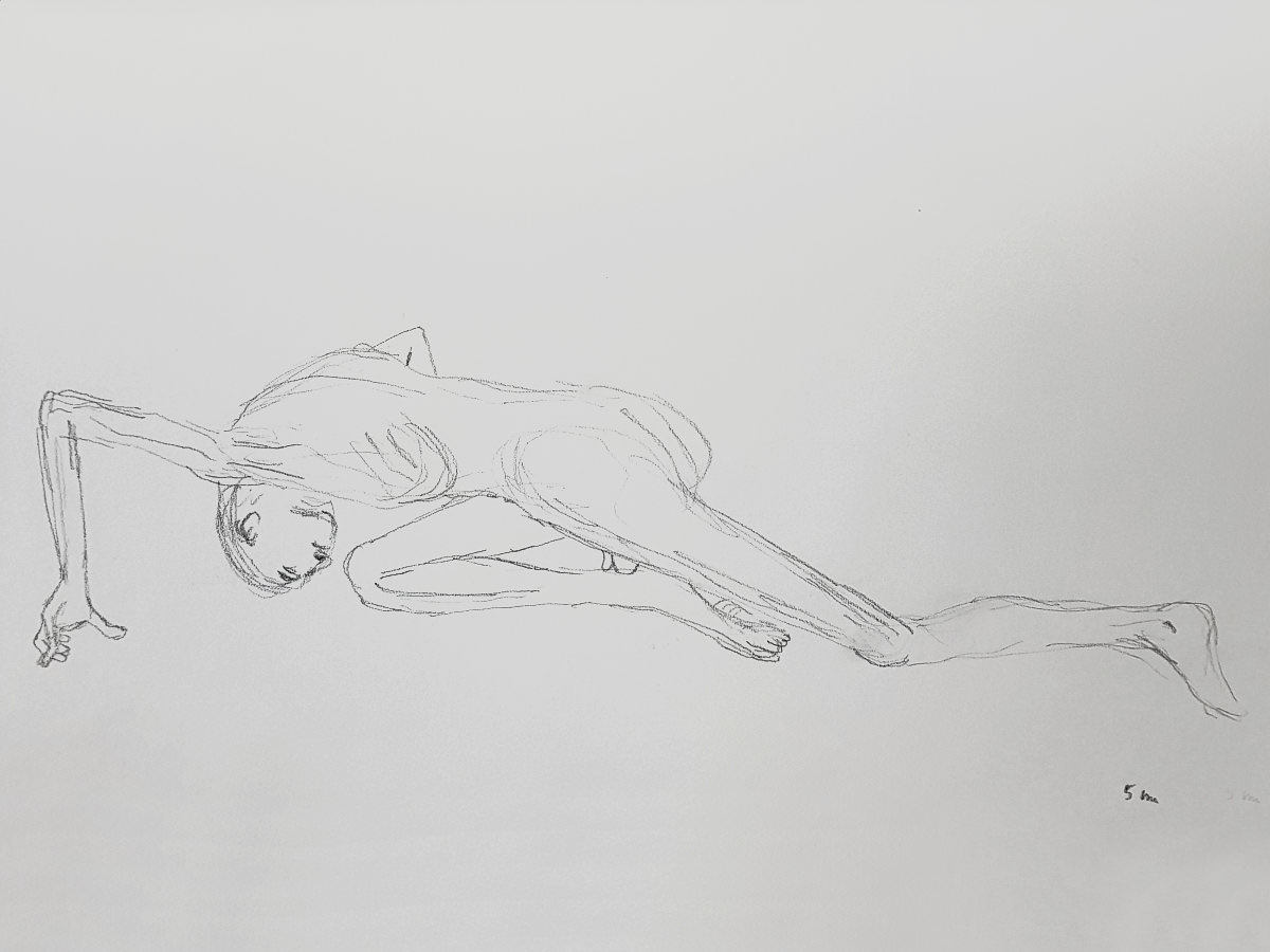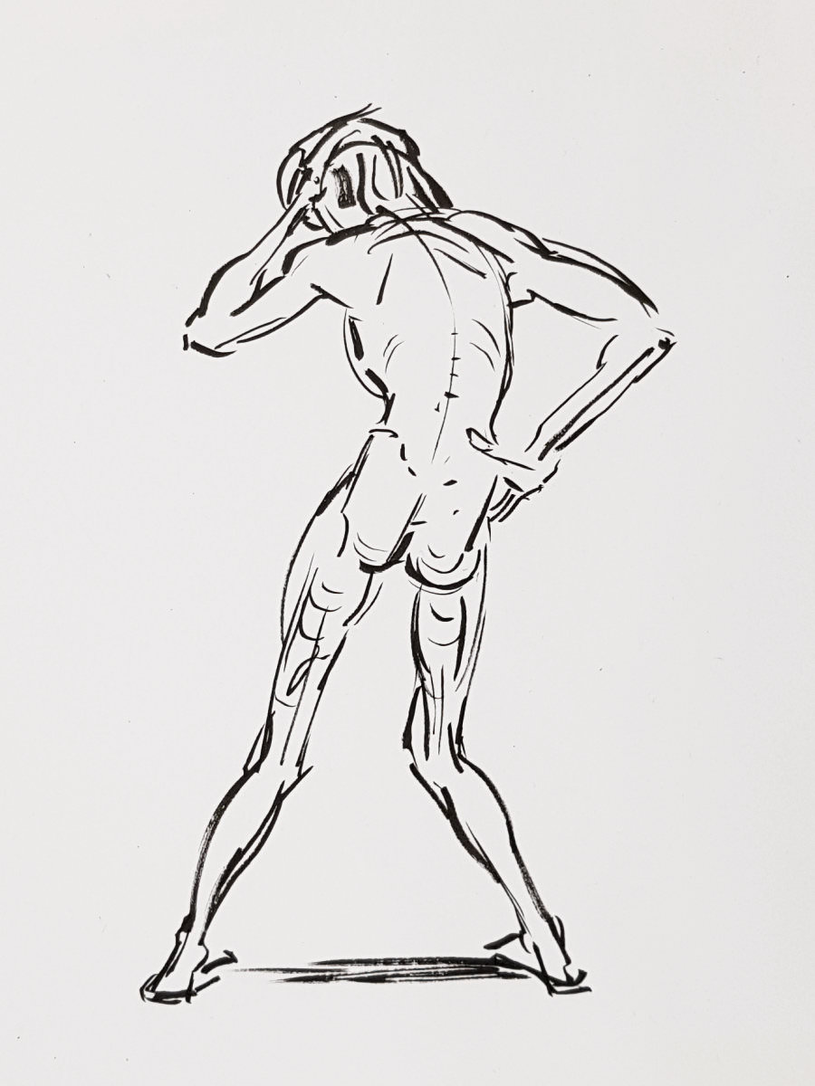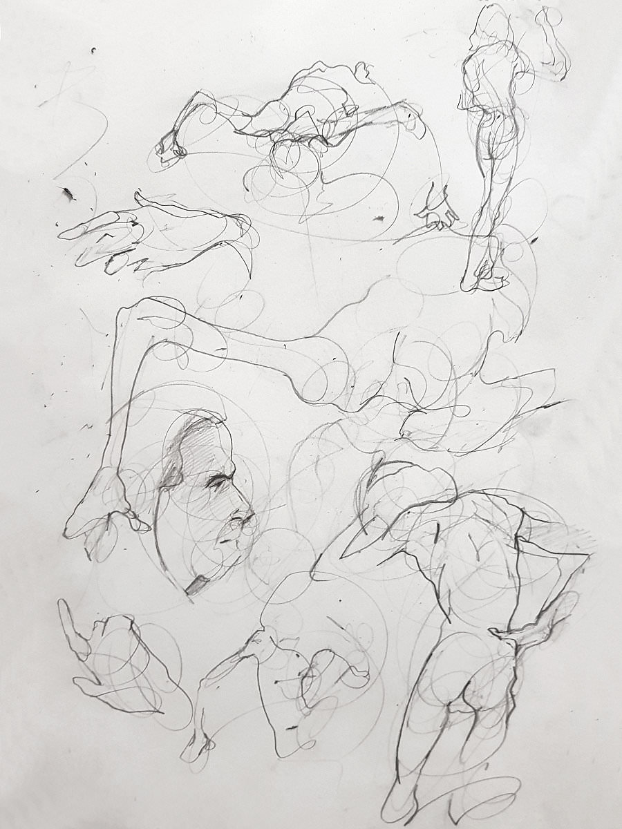 Working in the round, I rotated through a series of poses, adjusting and responding to the relative position of artists, translating my ideas of a silent, invisible communication with them. In these moments, I really felt the full joy of being back doing in-person life modelling. To a degree, short poses are an improvised performance.