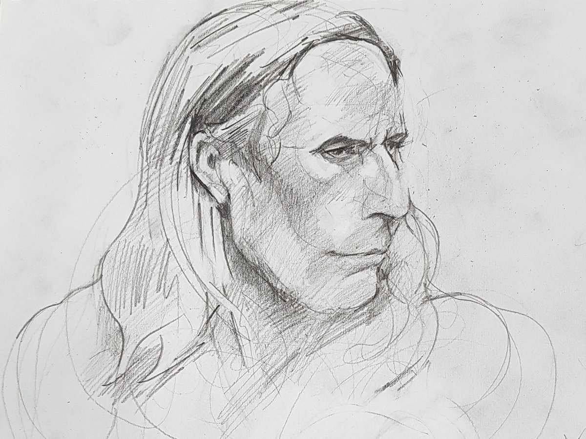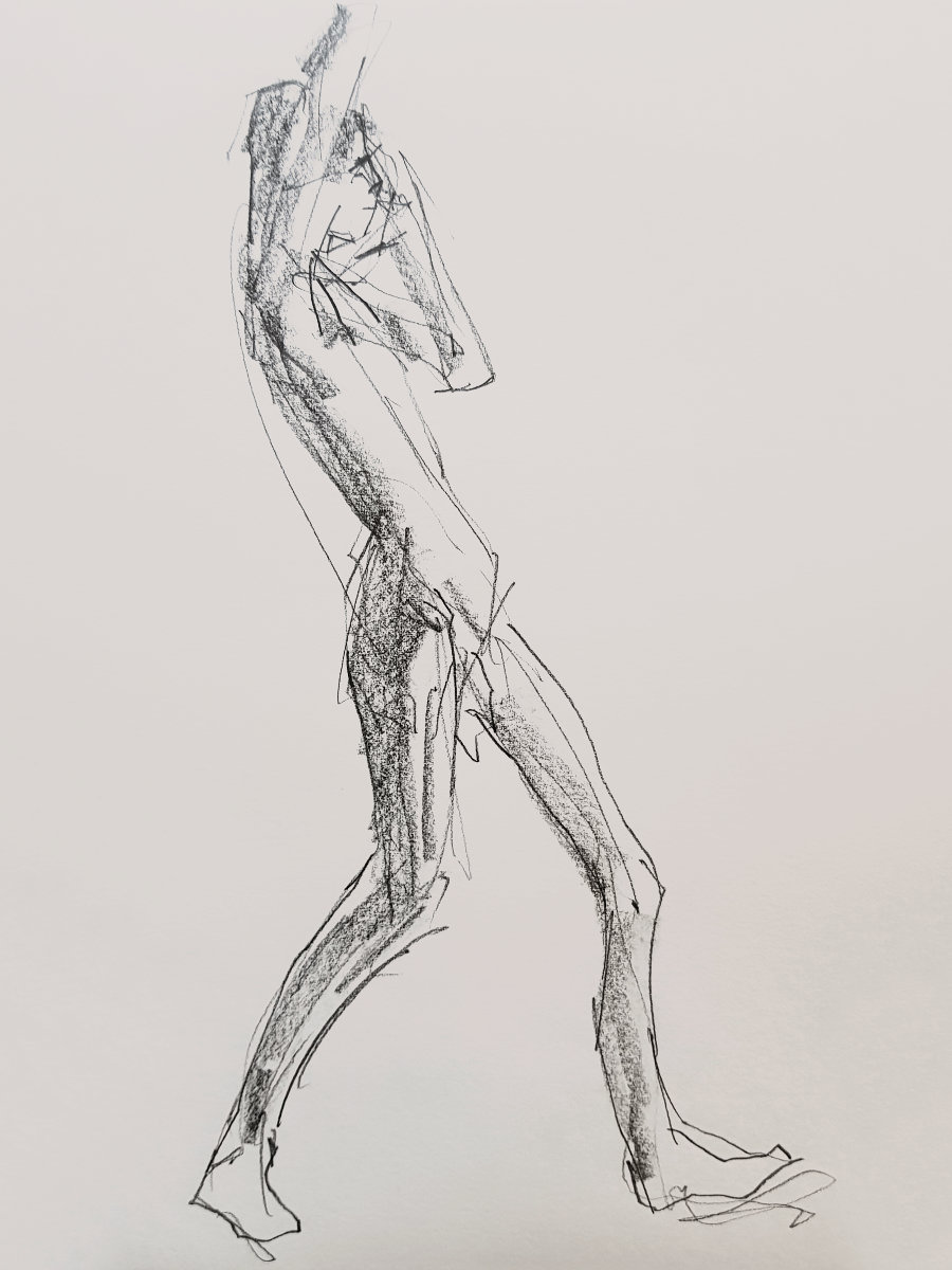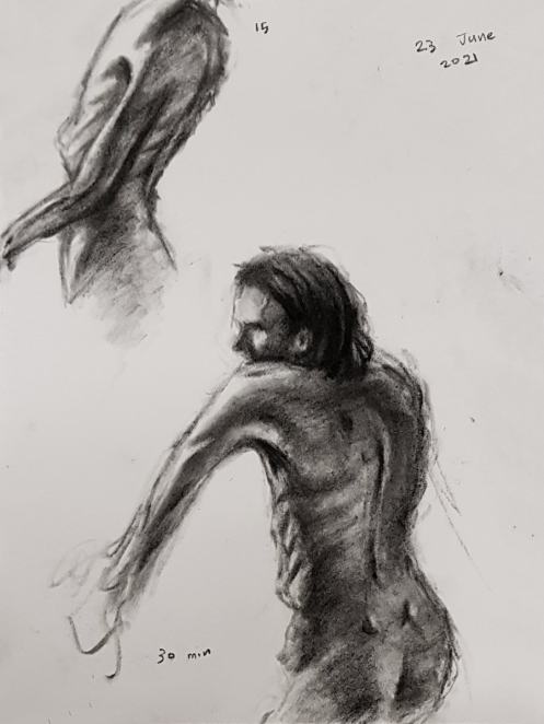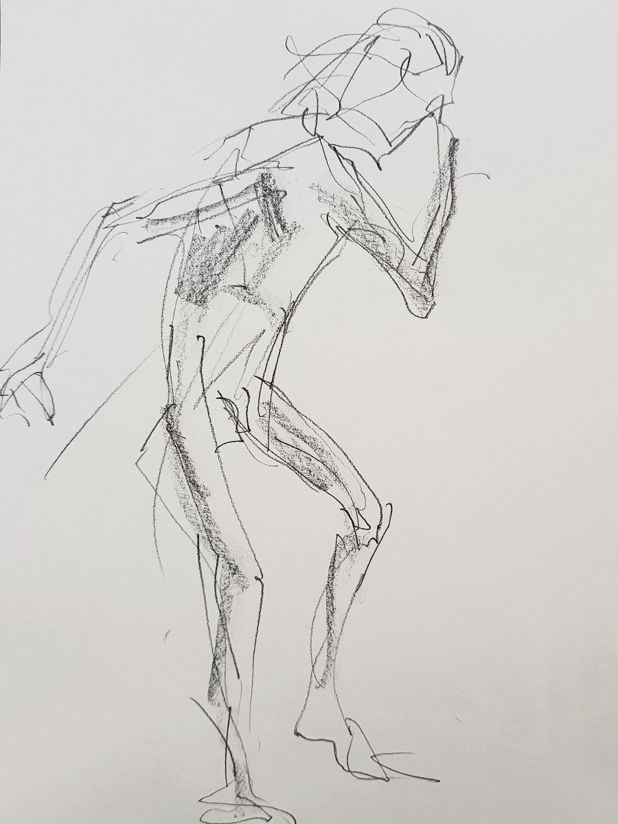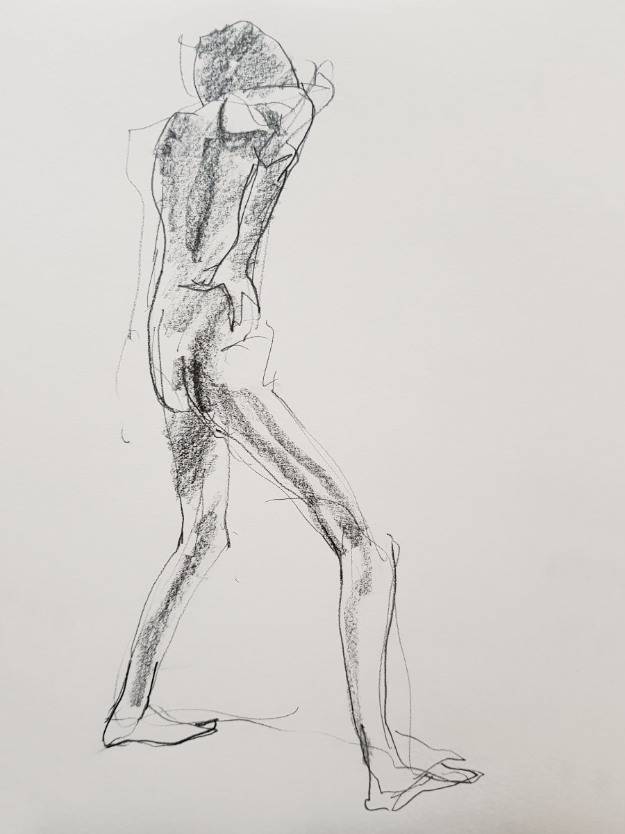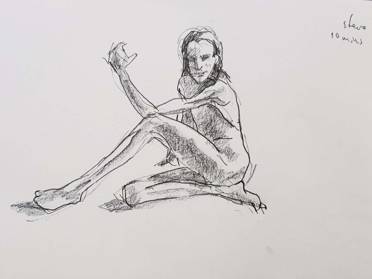 Upon arrival I was greeted by group organiser, Cliff, whose lockdown long-hair growth looked, pleasingly, to be the fruit of a laissez-faire evolution much like my own. In time we were joined by a dozen artists and got underway at 7pm with quick poses: three of 2-minutes and three of 5-minutes each