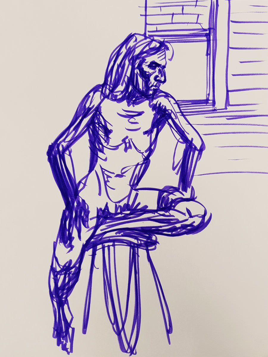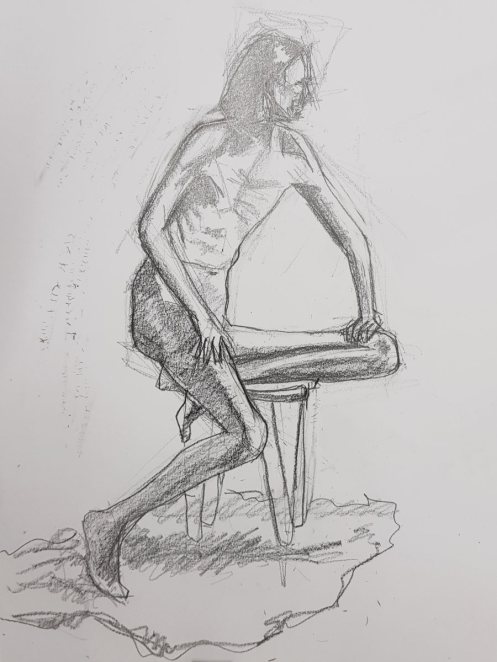 When we resumed at 8pm, it was with a single pose that would occupy all of the final hour. I opted to sit upon a low stool but contrived a few bonus angles to make it more interesting from every vantage point. During my two stretch breaks, I remained sitting to avoid the need for lots of place marking. I was aching by the end, but it was good.