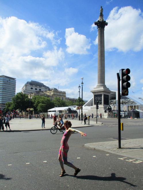 We paused midway along Victoria Embankment, again to be sure everyone was with us, and simply to soak up warm rays by the Thames. After passing beneath Waterloo Bridge and Hungerford Bridge, we turned right into Northumberland Avenue. Here an abundance of red buses kept our speed in check.