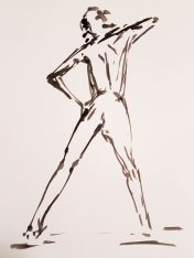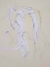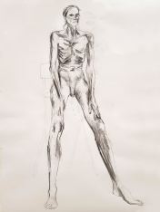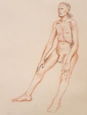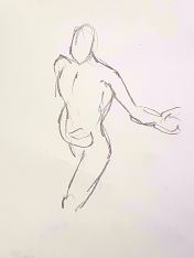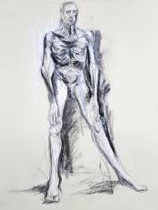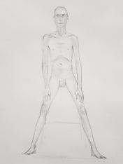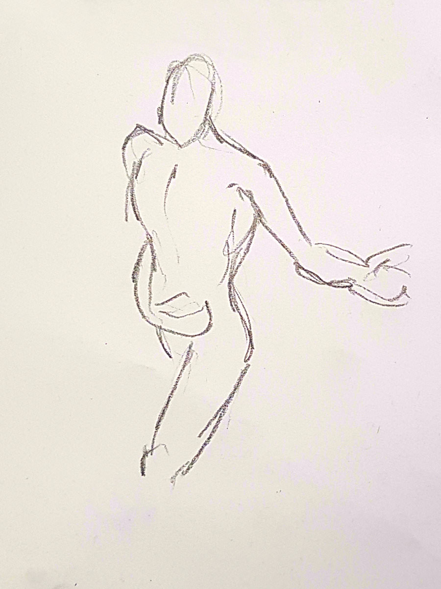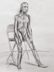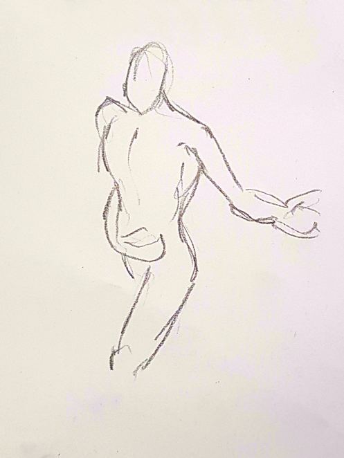When artists observe my upright figure in a long pose, their primary challenge seems always to be getting the proportions right. Specifically, overriding what their brain tells them about the more-often observed relative proportionalities of body and leg lengths so they can accurately represent my own somewhat freakish ratios. In this pose, they had the extra complication of angled legs lending a foreshortening effect from certain perspectives. All things considered, I reckon they did splendidly. I hope they returned home feeling as pleased with their artworks as I was.