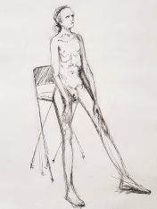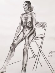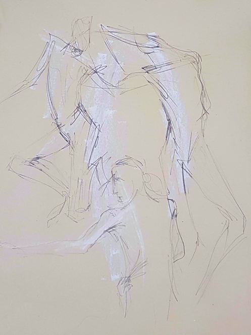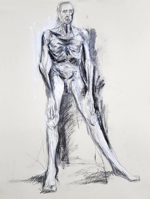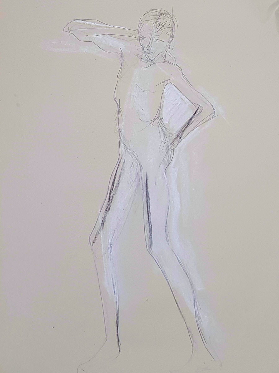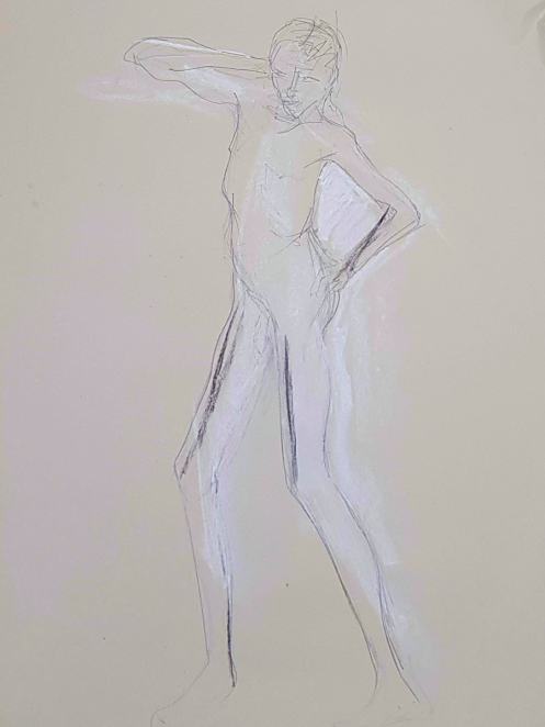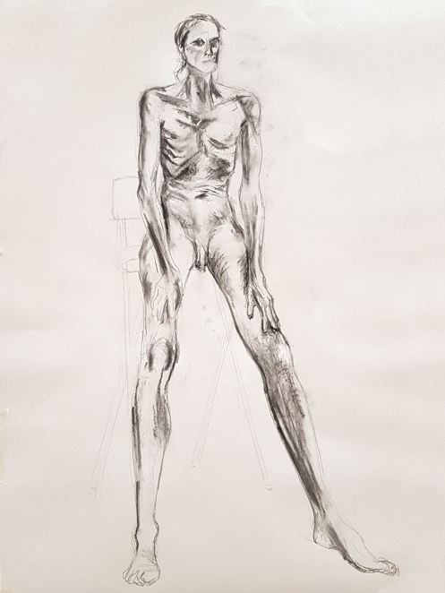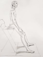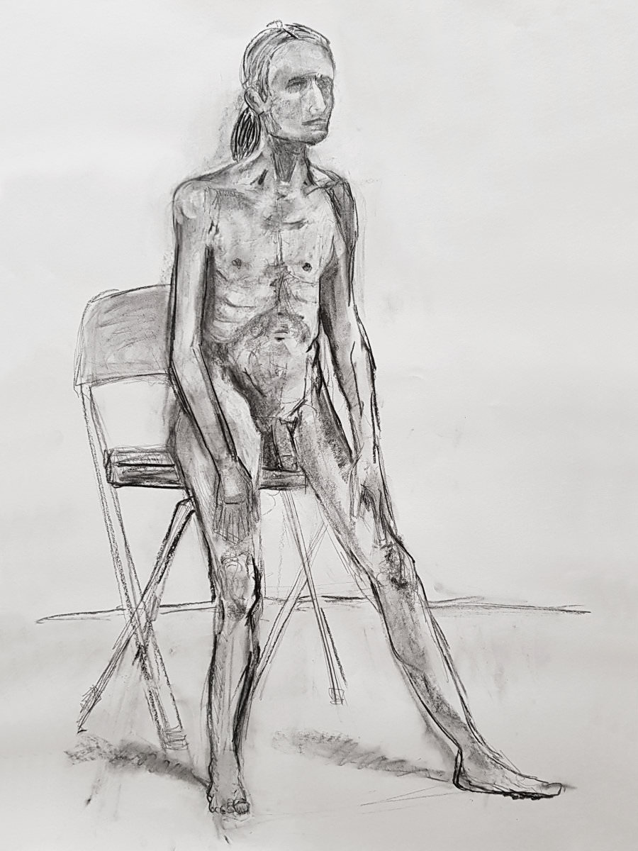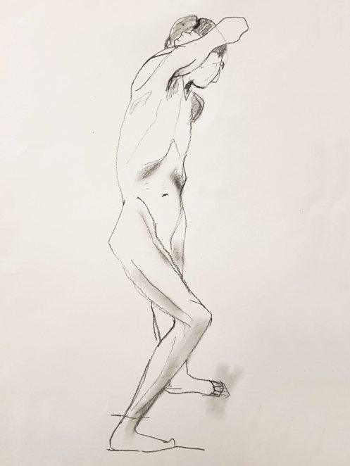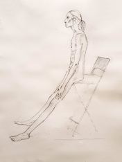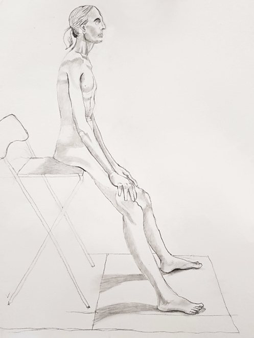 There were plenty of new young faces behind the pencils extended at arm’s length to measure my proportions. This is also encouraging, though it would be nice to see the pre-pandemic regulars enjoying their practice too. I hope they’ve stayed well and can return in their own good time. Meanwhile my next priority was to prepare a long pose. Victoria had a clear vision: my platform was moved to a side wall and a high stool put on top for me to part-sit, part-lean upon for around 2 hours. Quite straightforward and symmetrical; I think my only creative input was to rest my hands on my thighs.