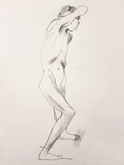 That most encouraging of sights greeted me as I entered the high-ceilinged Victorian art building of The Conservatoire in Blackheath: a full complement of artists’ easels set-out in a circle. In-person life drawing is back and perhaps more popular than ever. A wooden platform awaited me in the round. I positioned layers of foam across it to a satisfactory depth, spread my trusty white sheet over the top and was ready to begin. When tutor Victoria Rance and ten artists were ready too, I started with a traditional warm-up sequence: three poses of 1 minute, one of 5 minutes, one of 10 minutes.