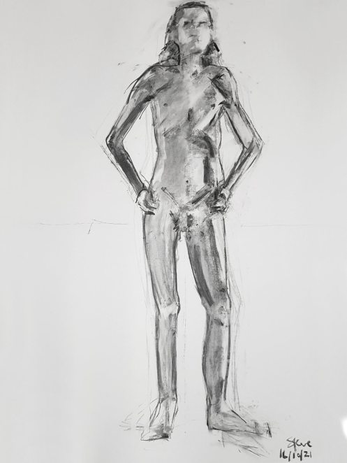 We began with six poses of 5-minutes each. I like this format a lot as it speaks to my preference for multiple dynamic poses, whilst allowing the artists just enough time for extra observation and consideration of their basic mark-making. But really quick work was to follow: ten poses of 1-minute each. Next, going from one extreme to the other, it was time to set-up the session’s long pose that would last around 2 hours. Naïvely I asked what kind of pose they would prefer. The answer: would standing be OK?