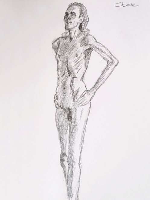 This return to Lochaber Hall for Saturday morning life drawing came exactly 2 years and 4 days since my last visit. I had been meant model there on 4 April 2020 but that booking was an early casualty of the pandemic. Still, better late than never. Eighteen months later than expected, I was back… and it was as though nothing had changed. As I ascended Lochaber Road, the familiar old brick building waited patiently, sturdily squatting on high. Inside, an arc of well-spaced easels embraced my pose space.