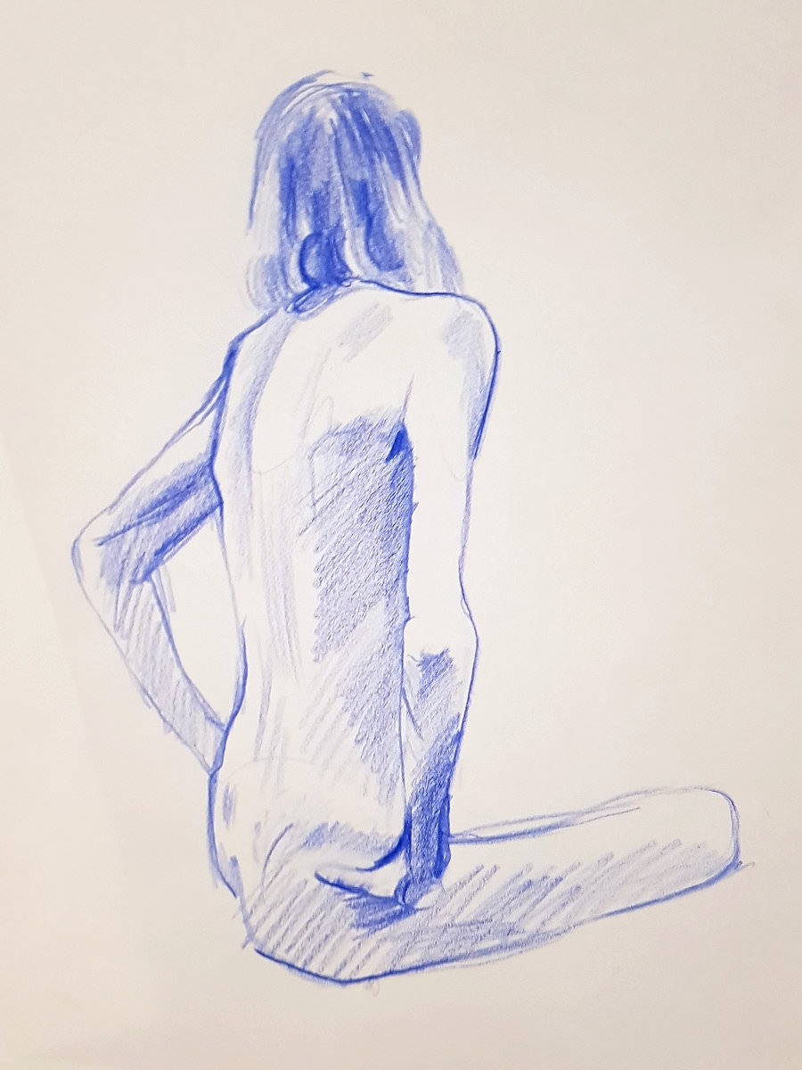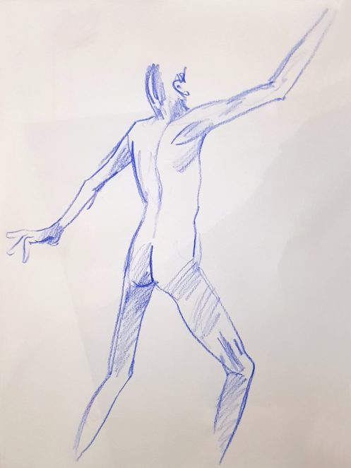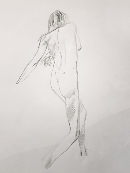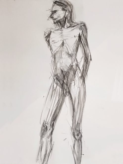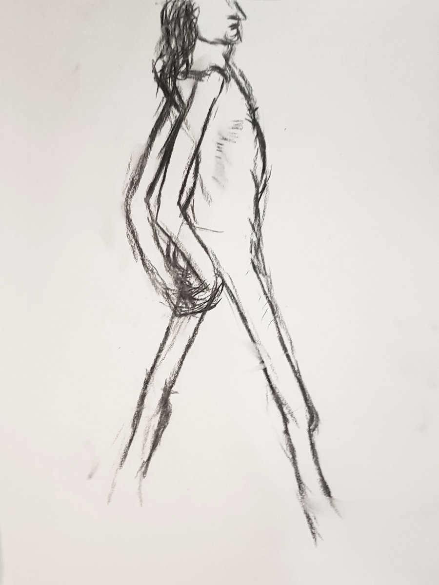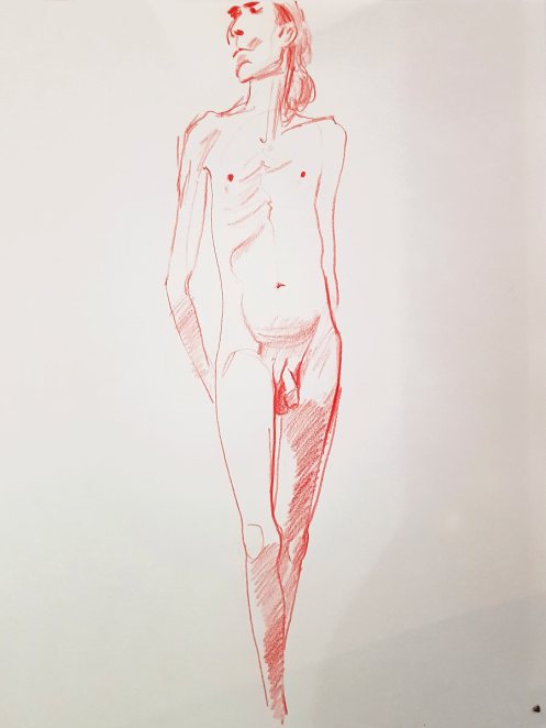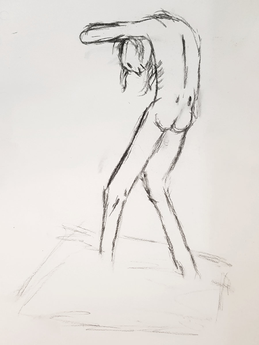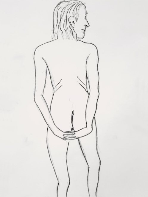 Having sat for 10 minutes, I got back on my feet for one more 10-minute pose before the break. I kept it simple: body vertical with right foot a short pace forwards, arms at my sides and hands clasped below my buttocks. As a pose, it doesn’t feel especially angular but the artists’ drawings demonstrate it’s just a matter of perspective.