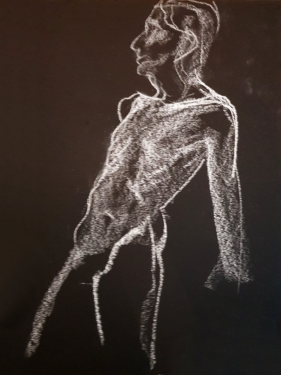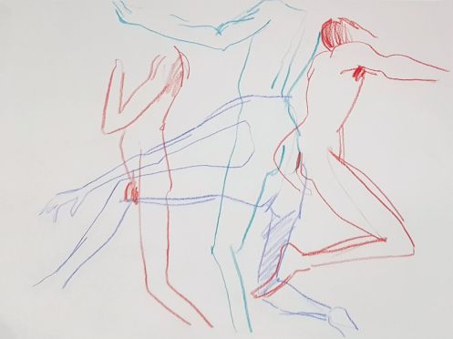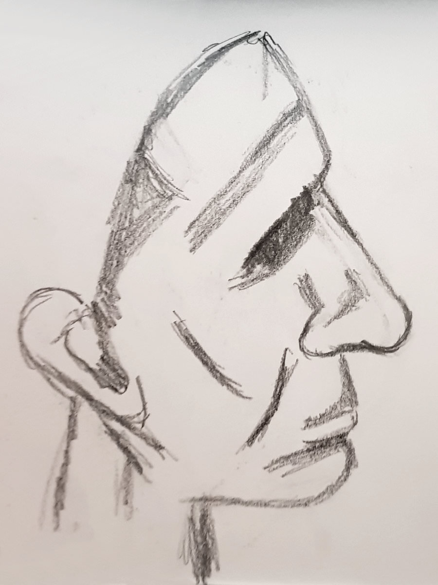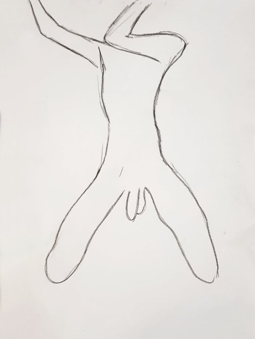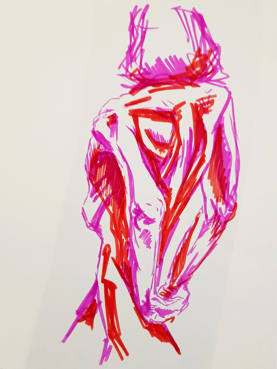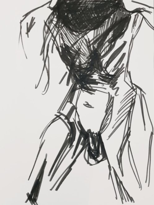 Having sat for 10 minutes, I got back on my feet for one more 10-minute pose before the break. I kept it simple: body vertical with right foot a short pace forwards, arms at my sides and hands clasped below my buttocks. As a pose, it doesn’t feel especially angular but the artists’ drawings demonstrate it’s just a matter of perspective.