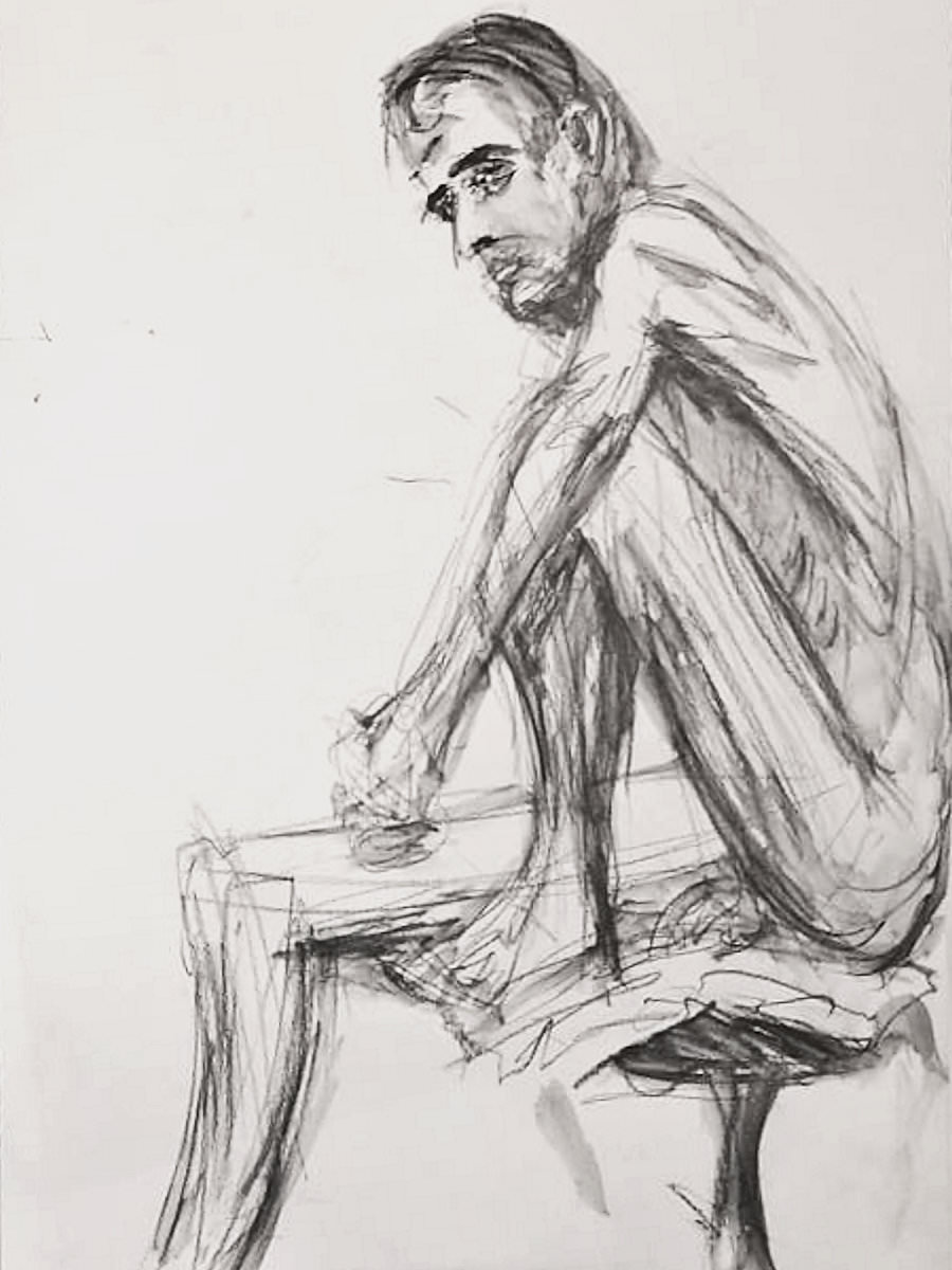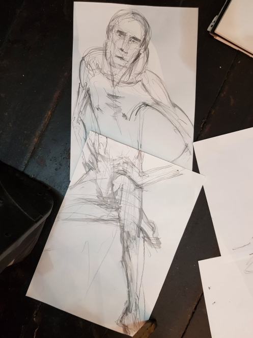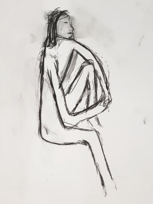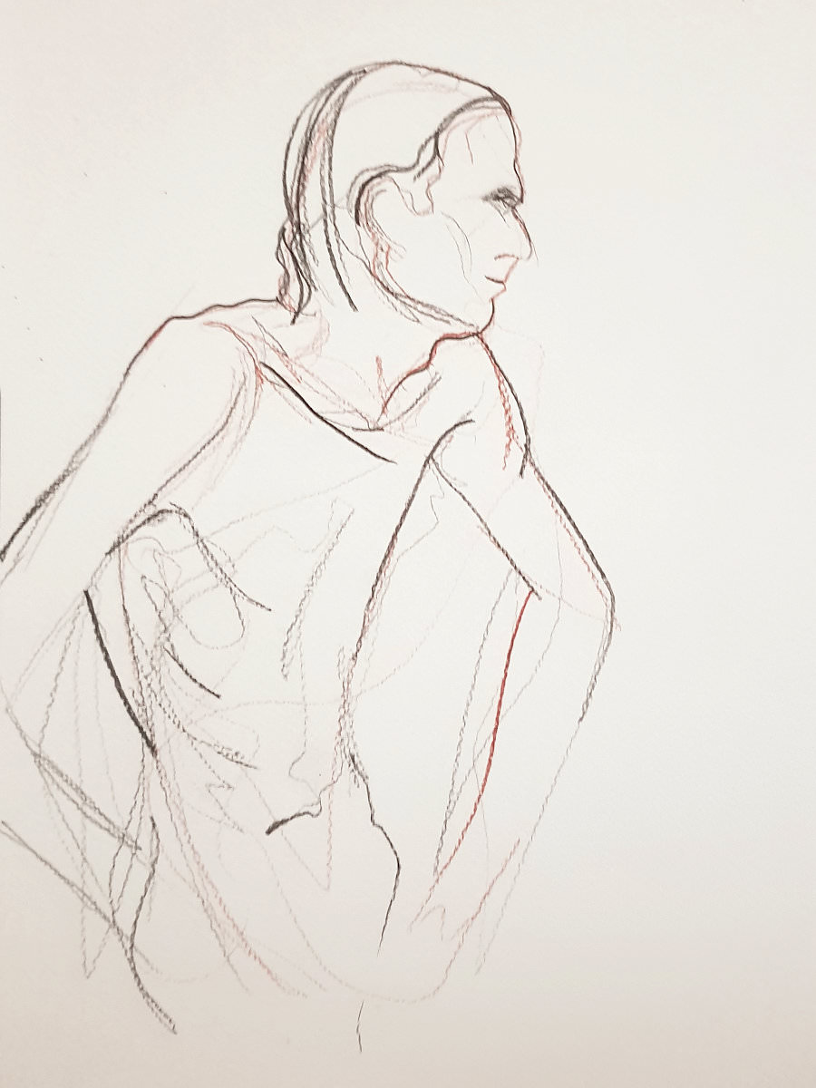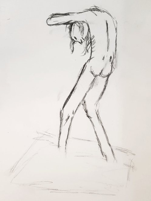 This venue, the group, the format, the music, the atmosphere, the organisation, have always energised me whenever I’ve modelled here. We began with very quick poses: 5, 4, 3 and 2 minutes, then three of 1 minute and three of 30 seconds. Working in the round, I knew what the next pose would be only a few moments before the artists.