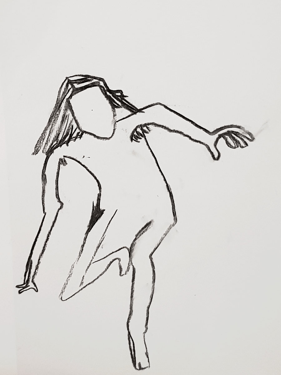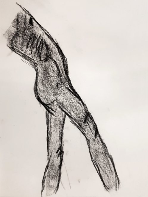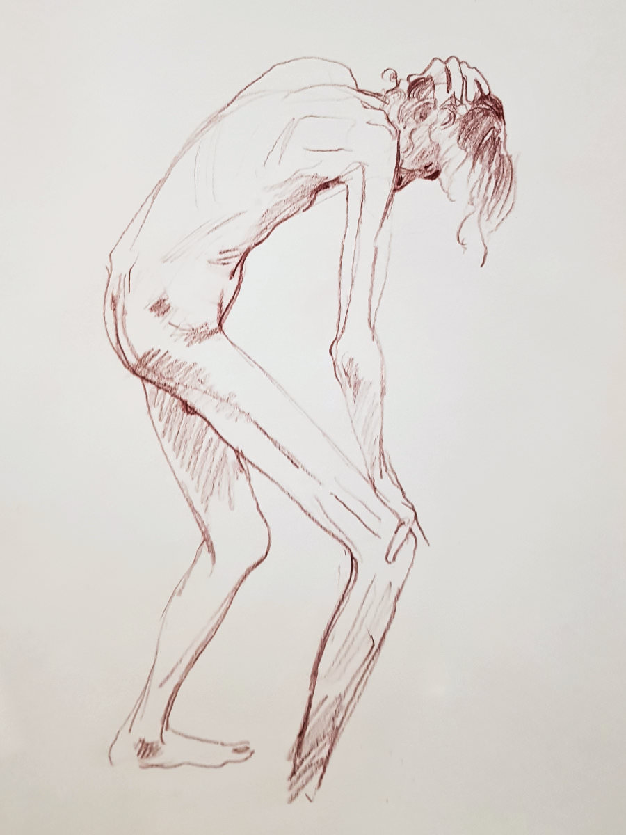 To fill the last half-hour, Catherine offered her artists a choice: three 10-minute poses, two 15-minute poses, one 30-minute pose, or a 10 and a 20. It appeared half wanted three 10s and half wanted the 30 so our compromise was a 10-minute and 20-minute pose. I started with a standing cringe, left hand on head, right hand on knee.