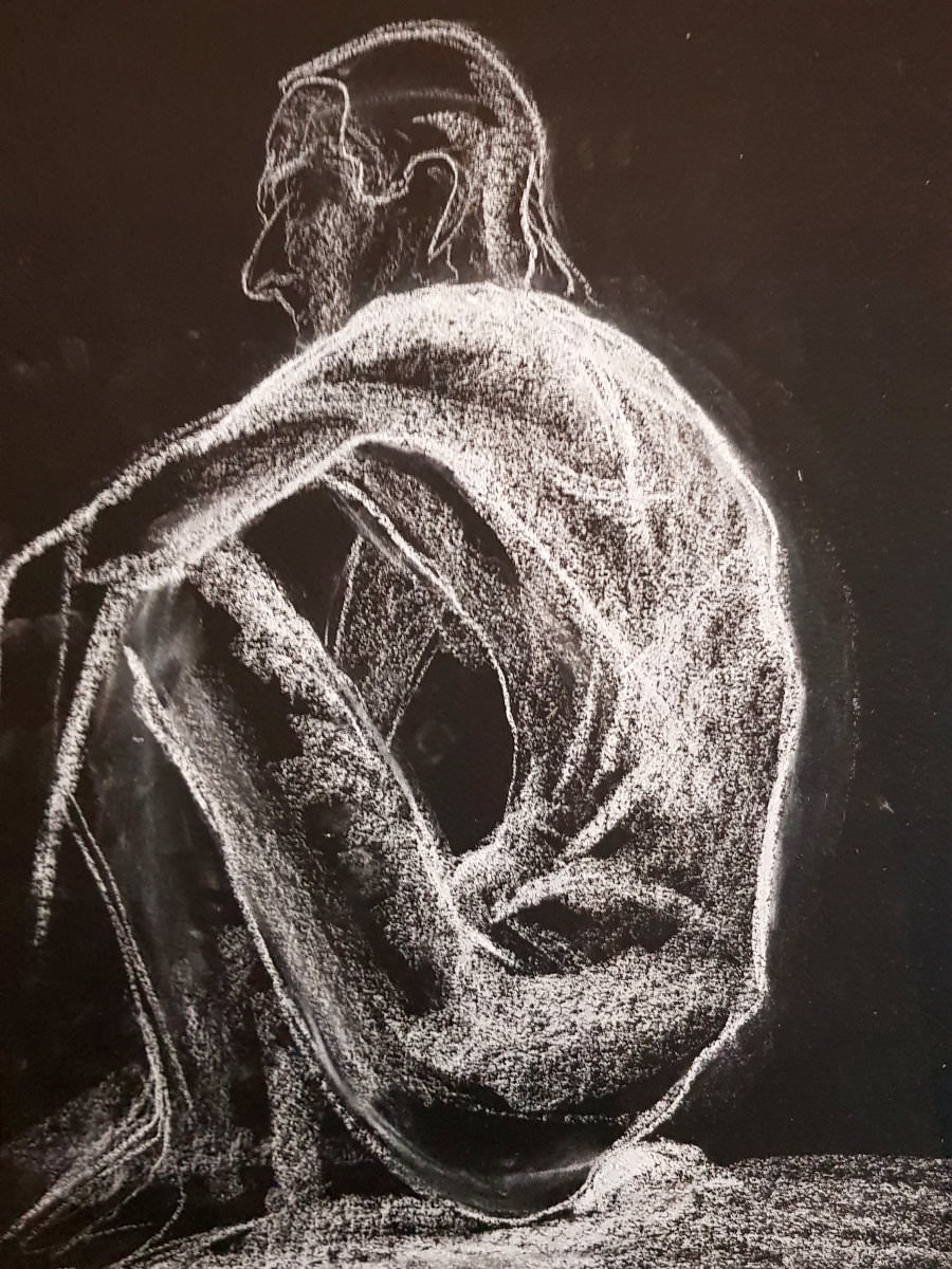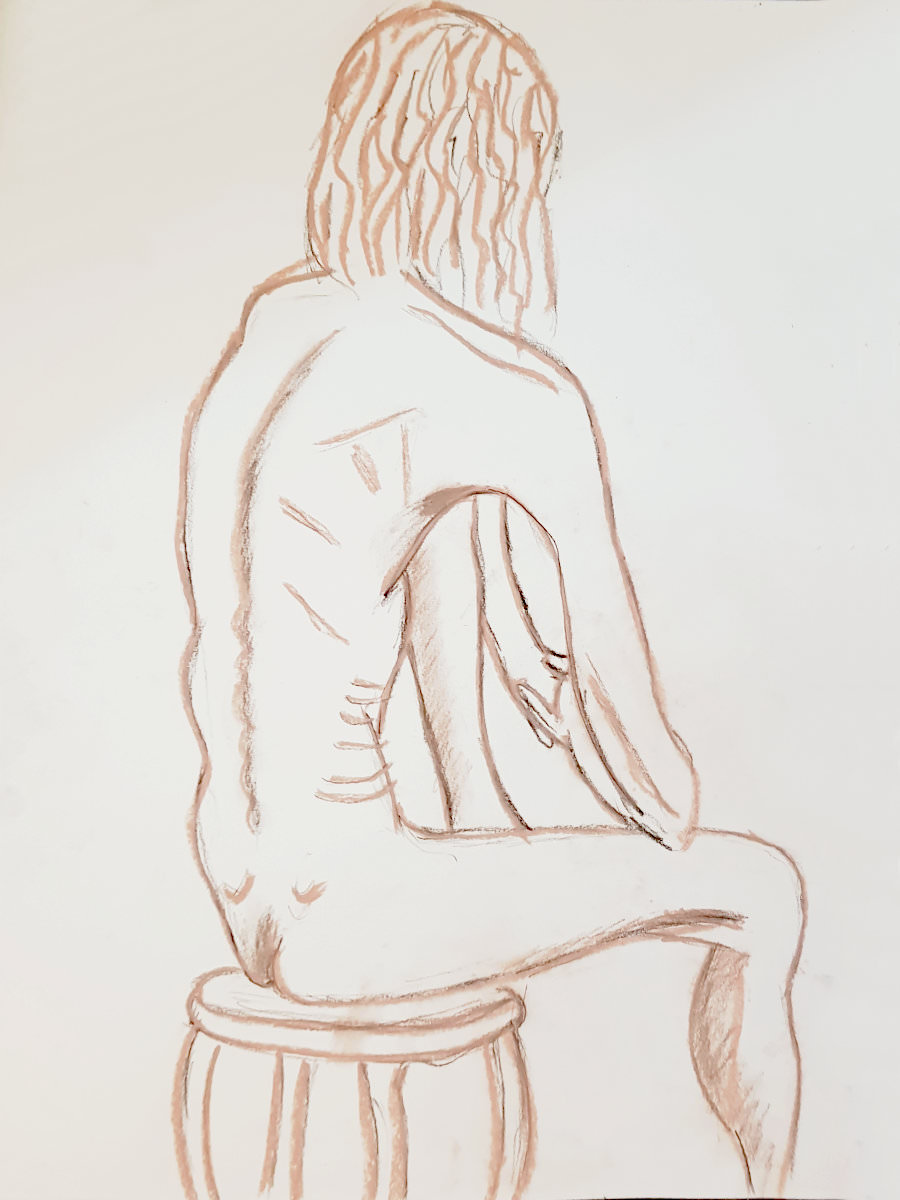 For the long pose I was seated once more. This time, rather than draping the sheet I folded it beneath me so my own legs and those of the footstool would remain in view from all sides. With limbs comprehensively angled, I settled down in unlikely comfort to enjoy the final moments of a splendid session.