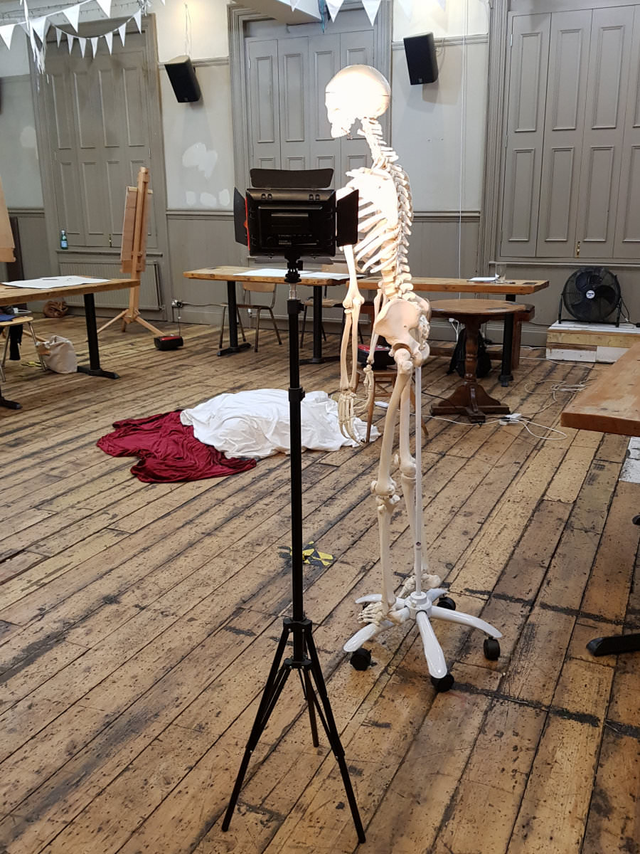 I’ve modelled for Life Drawing at The Birds several times previously – most recently in July – but this session would be different. For a start, it was week one of a 6-week course. Most intriguingly, however, it was to begin with an anatomy lesson, in which a human model (me) would be examined in detail next to a full-size replica skeleton…