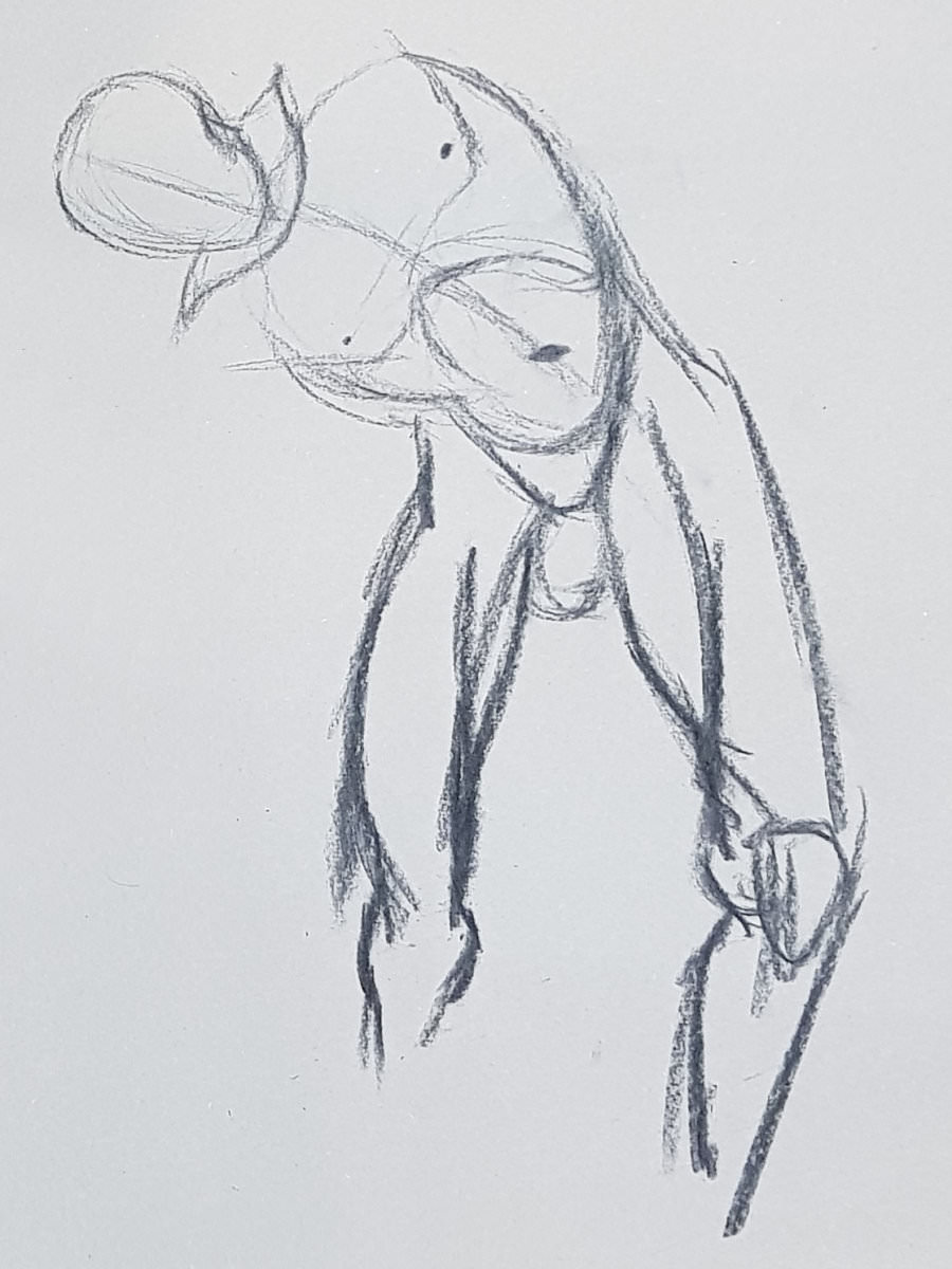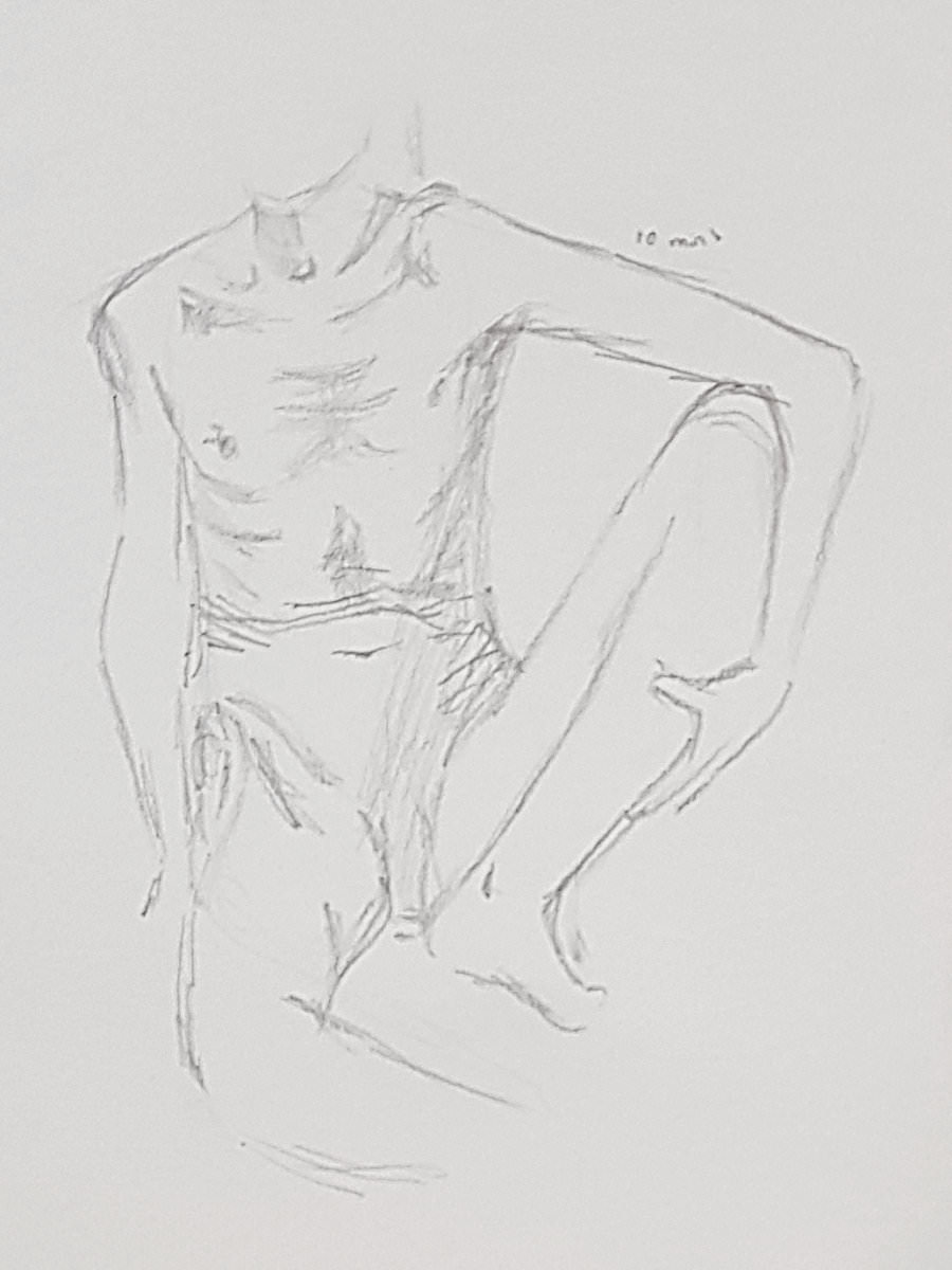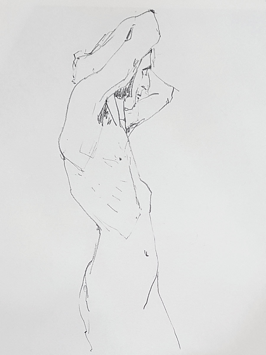 Time flies. Our intention had been to double the pose-length once more but we found we had just enough left of the first half for another 10-minutes. I decided to go simple again, standing up straight, albeit now with one forearm raised and the other pointing down to the floor. Cometh the break, artists filed downstairs for drinks.