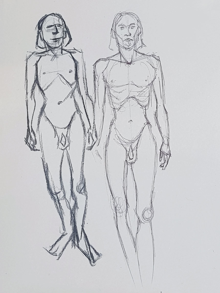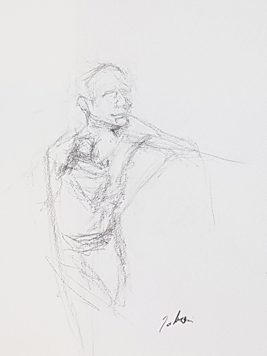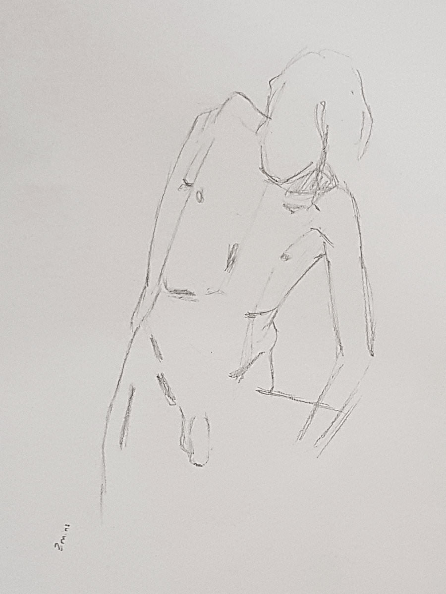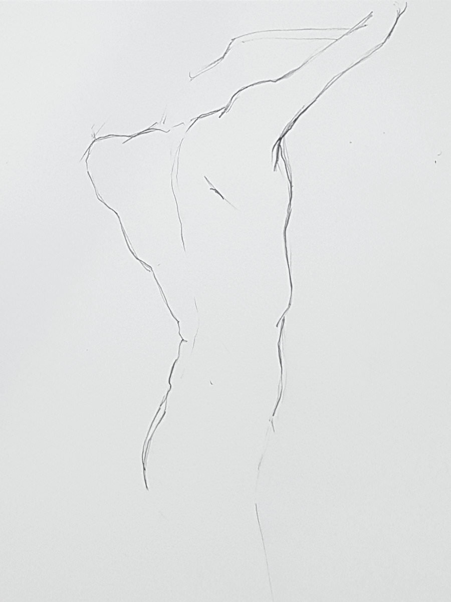 Time flies. Our intention had been to double the pose-length once more but we found we had just enough left of the first half for another 10-minutes. I decided to go simple again, standing up straight, albeit now with one forearm raised and the other pointing down to the floor. Cometh the break, artists filed downstairs for drinks.