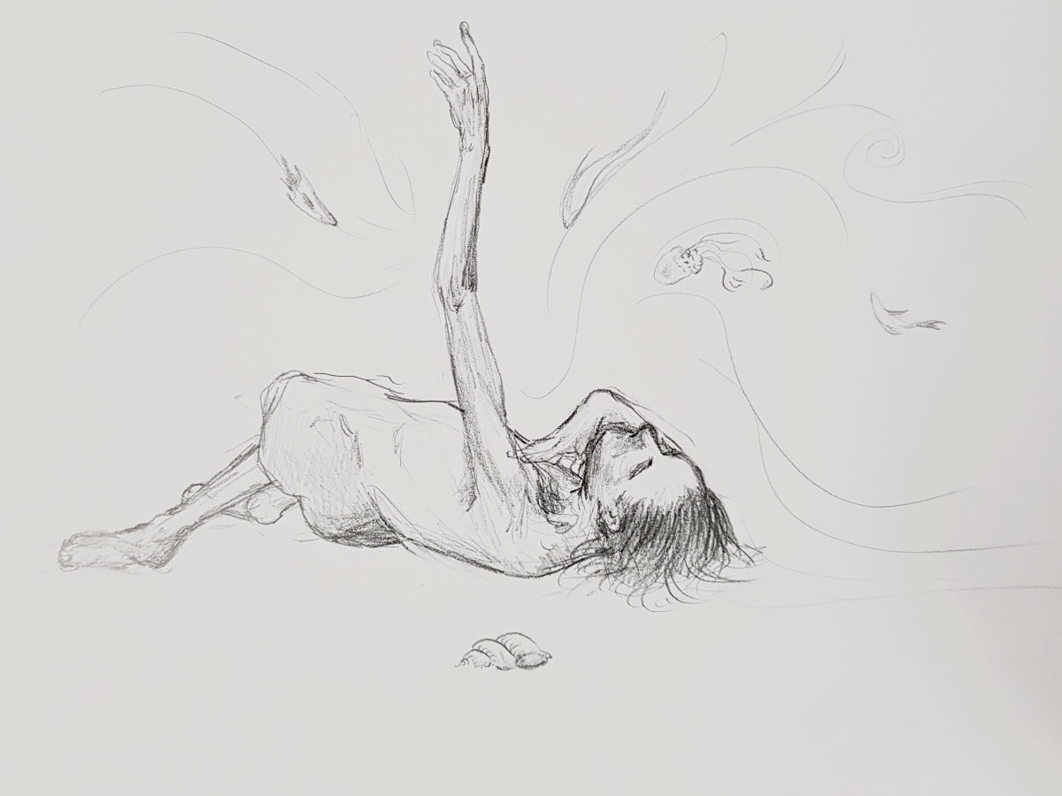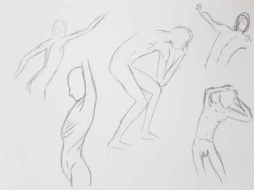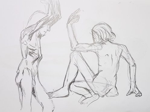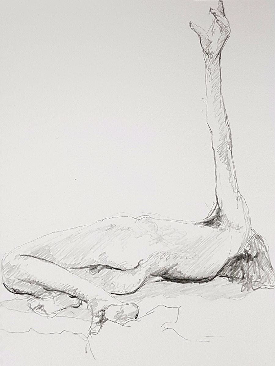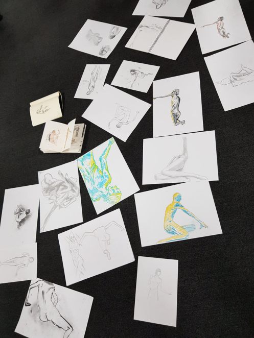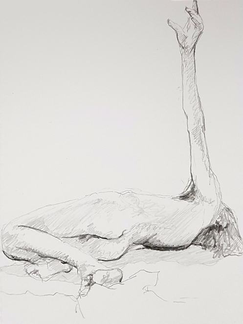 It was agreed that we would complete the session with two poses of 15 minutes and one pose of 20 minutes. I stood: right hand on right shoulder, left arm outstretched. I sat: legs folded beneath me, both hands on the floor. I lay down: right hand on chest, left arm raised. At the end, after a little cajoling from our leader, a few of the students put their drawings on the floor. Very good they were too. It’s good to share. 🙂